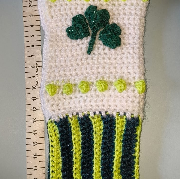 Hand-made from acrylic & polyester yarns in a non-smoking home. Please see photos for measurements before placing an order (ladies size 6-7). Design in shades of green & white featuring a shamrock motif.