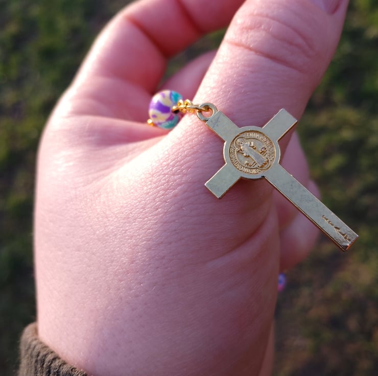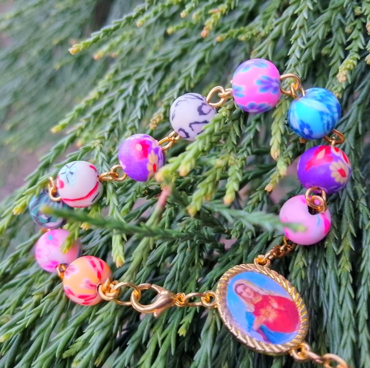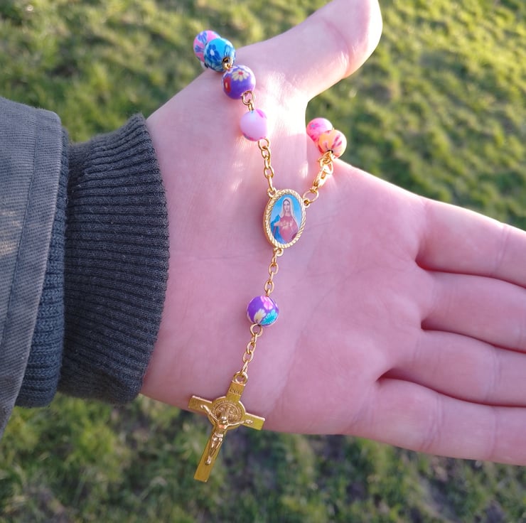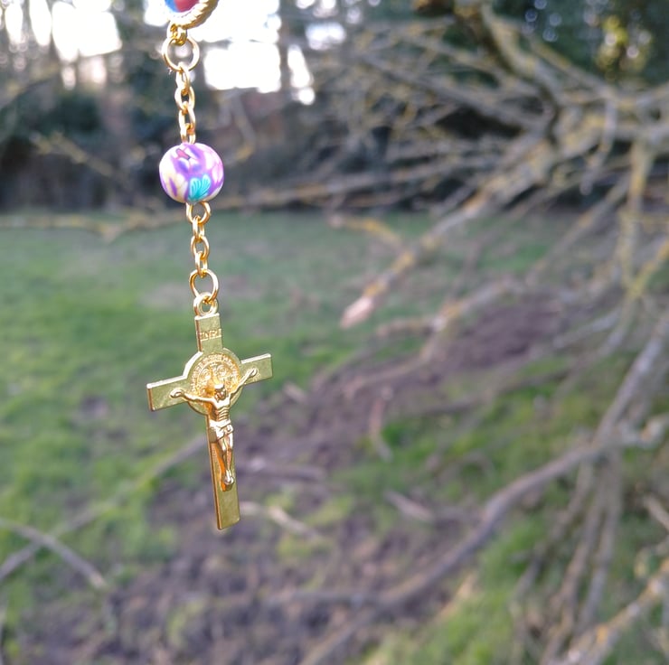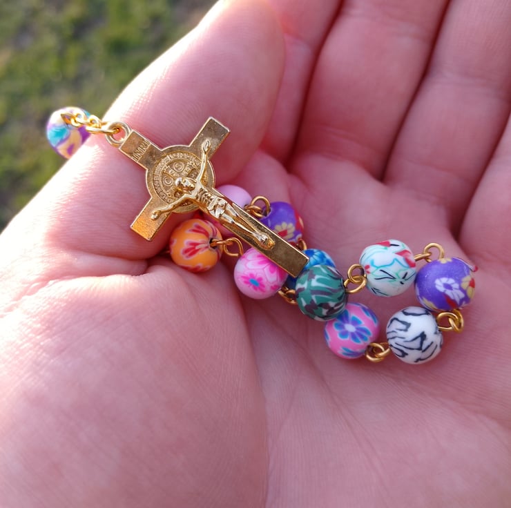 This is a colourful positive rosary I have done , I always love make new jewellery and thought I'd have a go at a resin rosary beads, this is great to hang in the car or just to have on you sort of like worry beads , this is a single decade version of rosary beads and also has a clasp , you could wear it as a bracelet but you have to have pretty thin wrists