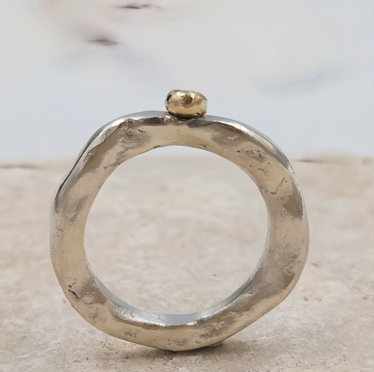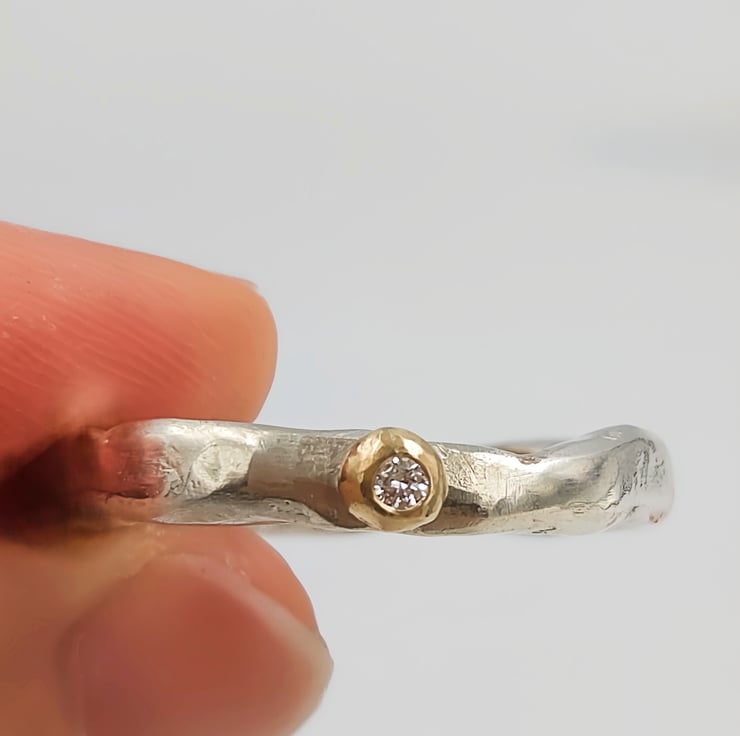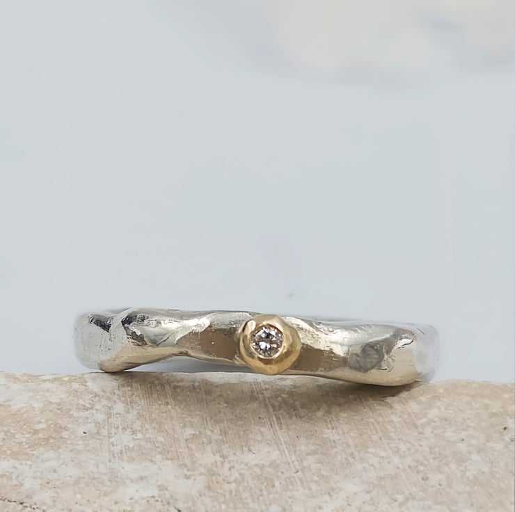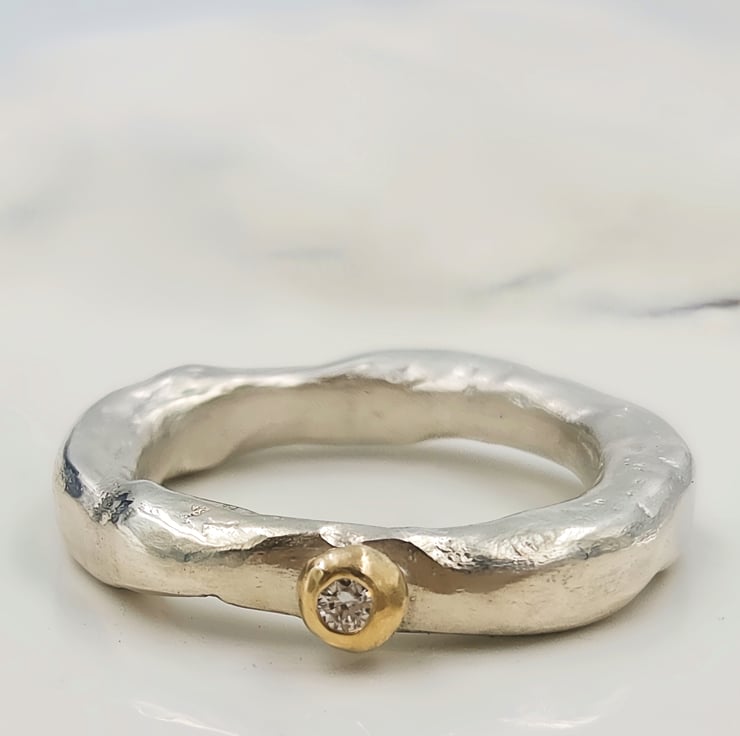 Features a 2mm white lab diamond, flush set into a unique gold granule accent.