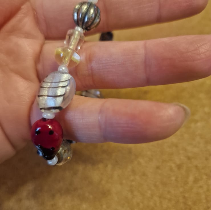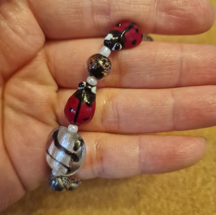 Lampwork style beaded bracelet with novelty beads, medium size. The novelty beads includes ladybirds and a mushroom.