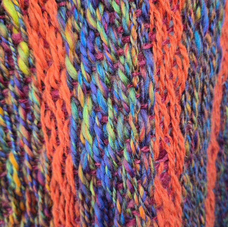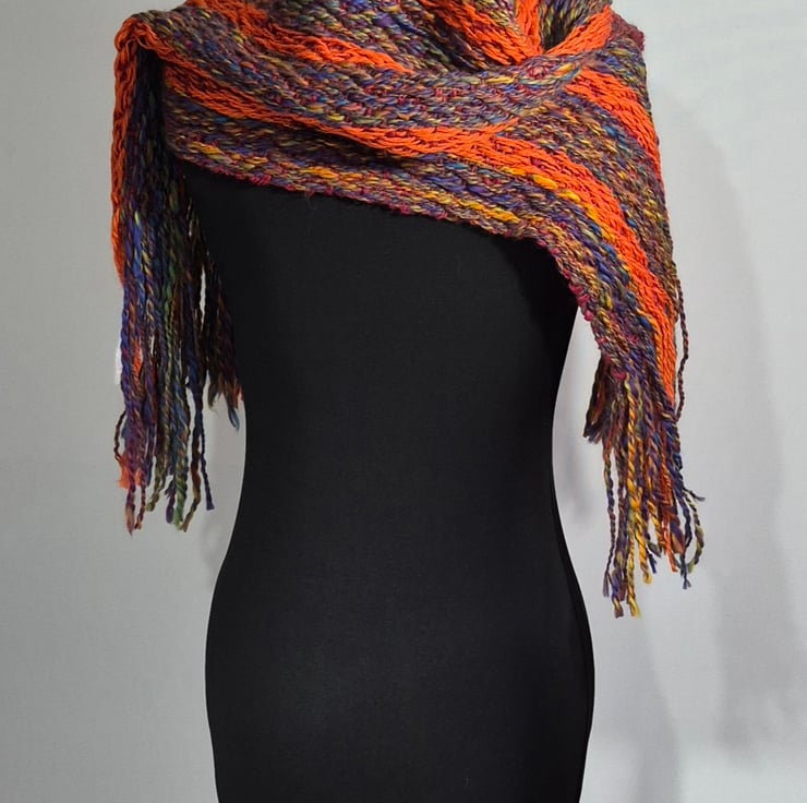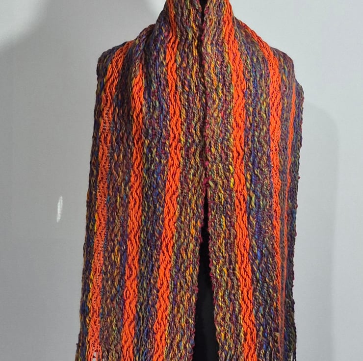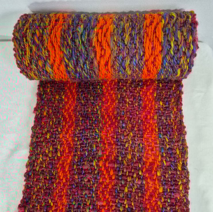 This scarf is a riot of colour, orange and multicolour brown based yarn. This was not meant. I carded the tops too much and of course just like when we were children mixing bright rainbow colours, the end result was brown! I like it .The weave is different on both sides but both sides could be the right side. You choose.