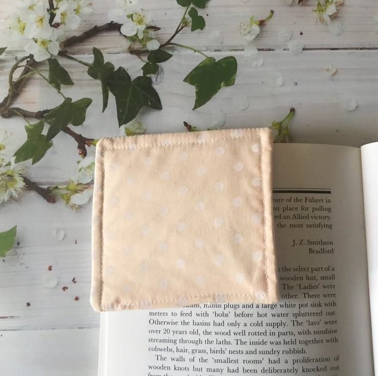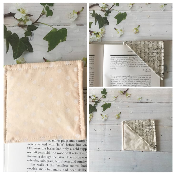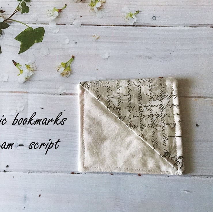 A fabric corner bookmark handmade from cream script cotton fabric