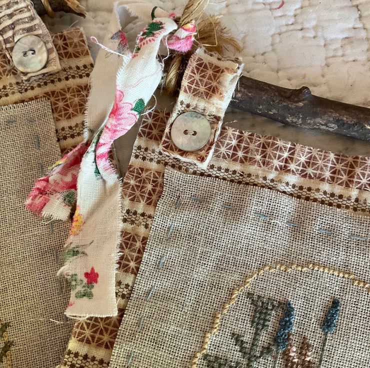 The quilt hangs from a wooden stick which is threaded through two quilt tabs, attached by 2 pearl buttons. An antique fabric strip is tied round the jute string, from which the whole piece hangs.