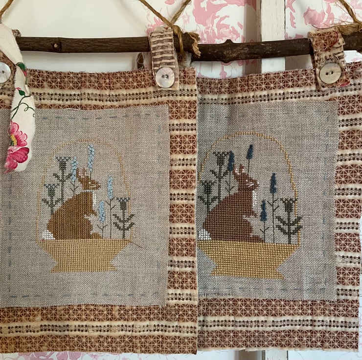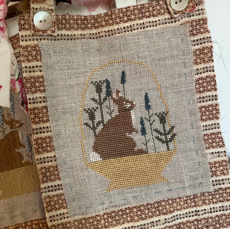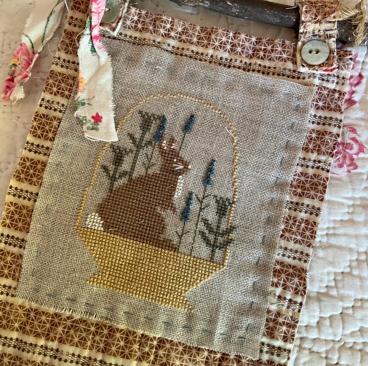A gorgeous seasonal cross stitch on 28 count linen, displayed onto a piece of 19th century antique quilt, which is striped on the reverse. The embroidery is attached with a running stitch, and all edges are left raw.