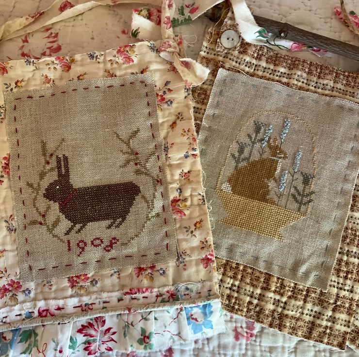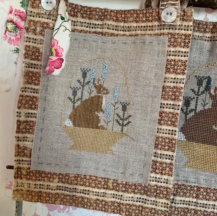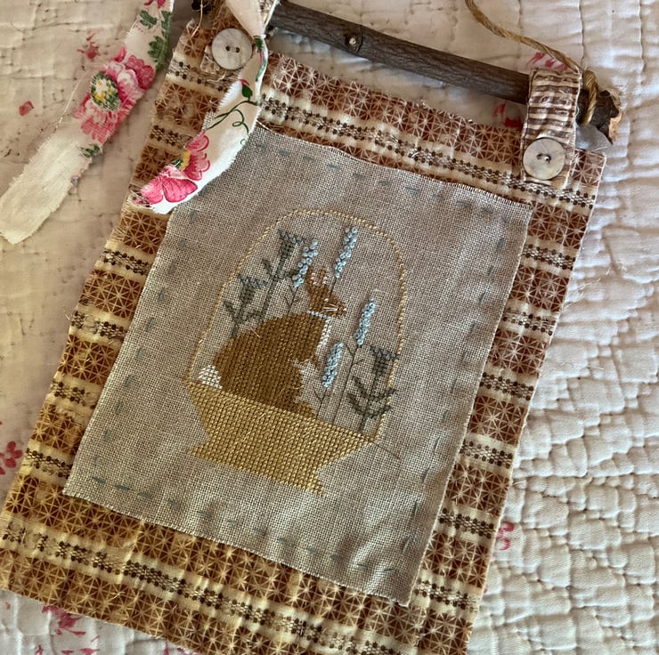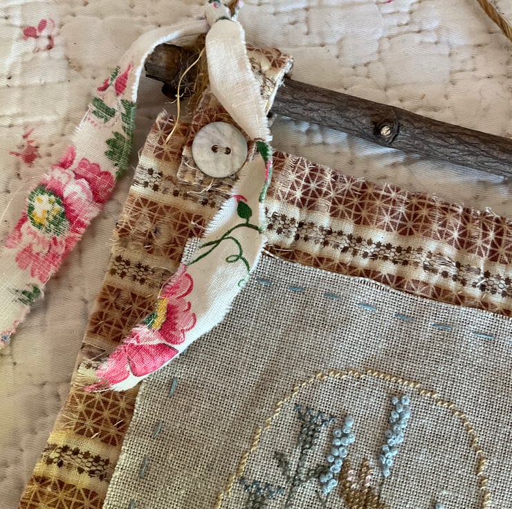 A gorgeous seasonal cross stitch on 32 count linen, displayed onto a piece of 19th century antique quilt, which is striped on the reverse. The embroidery is attached with a running stitch, and all edges are left raw.