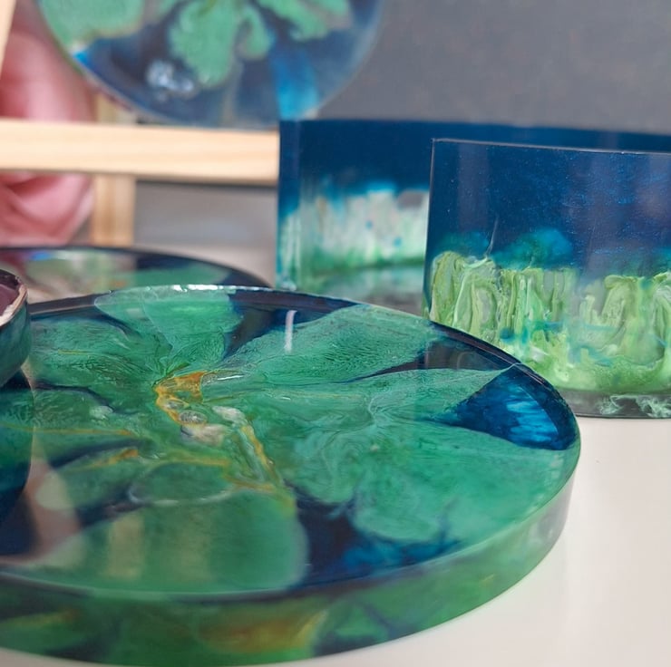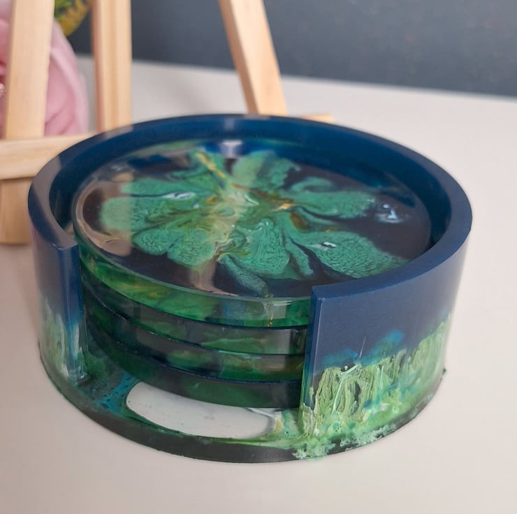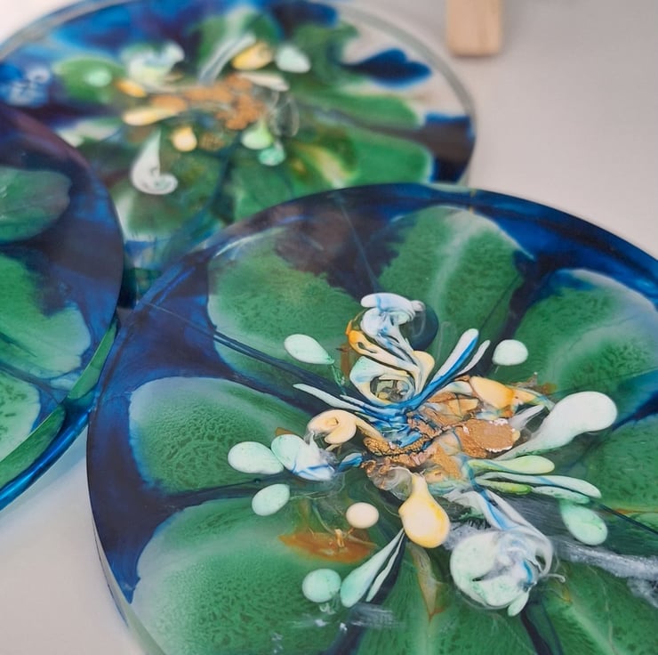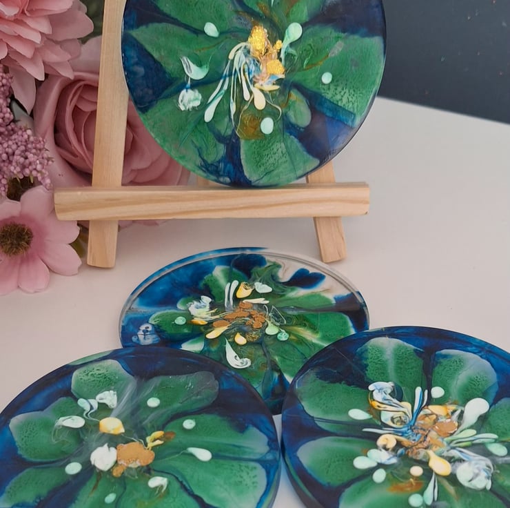 A set of handmade resin coasters in a mix of deep blues, greens, and metallic gold. I’ve called this set Peacock Bloom because of the colours.
