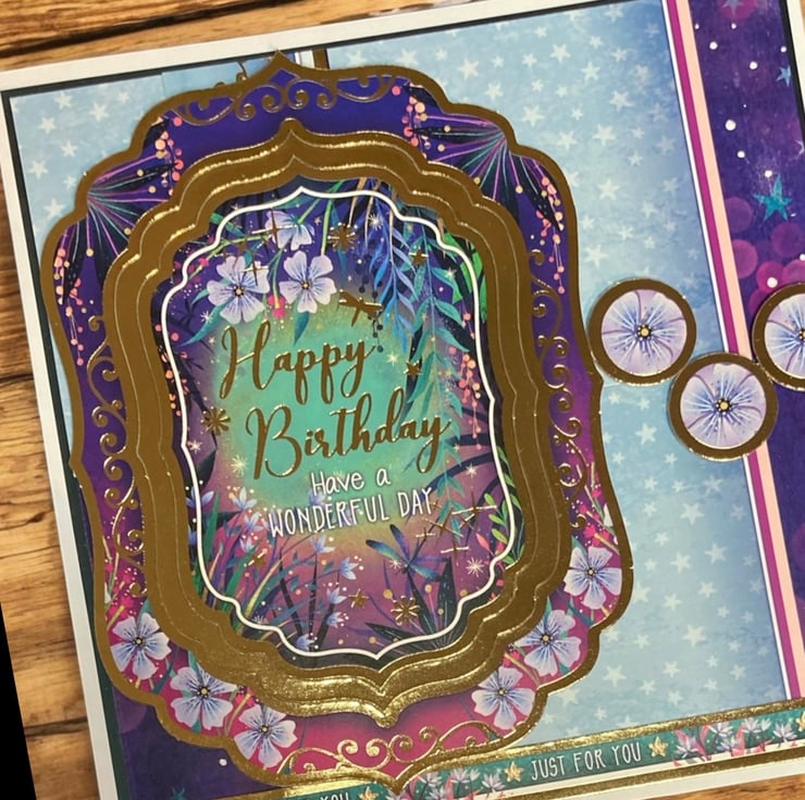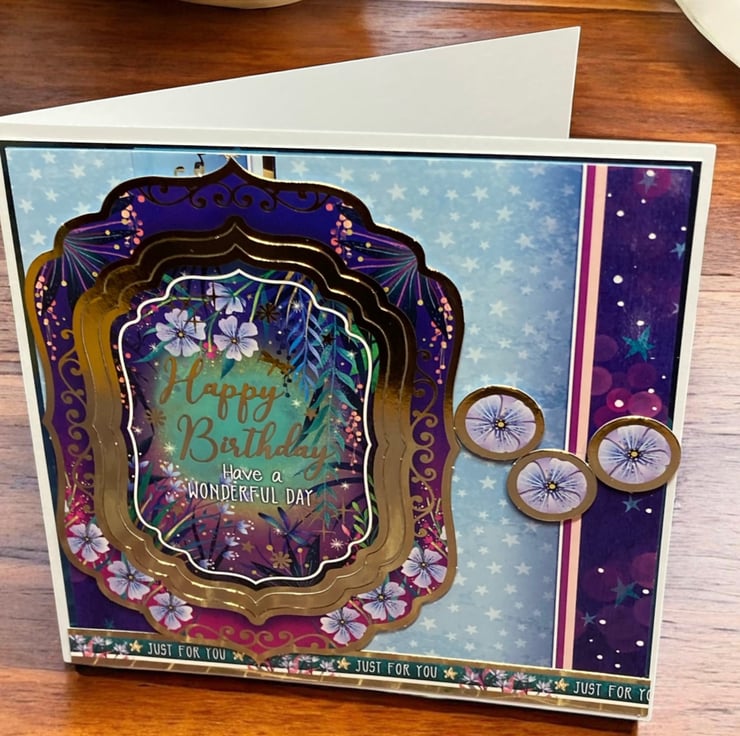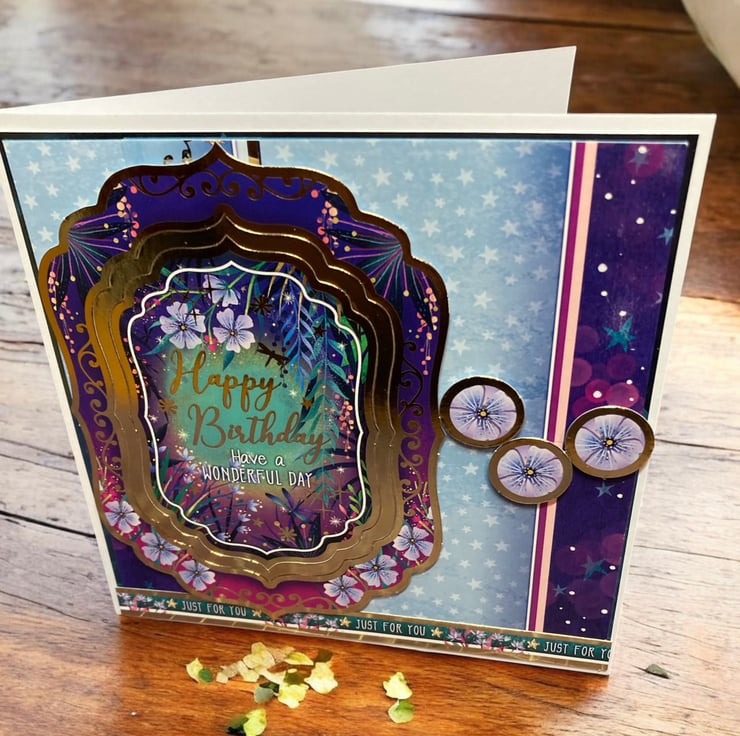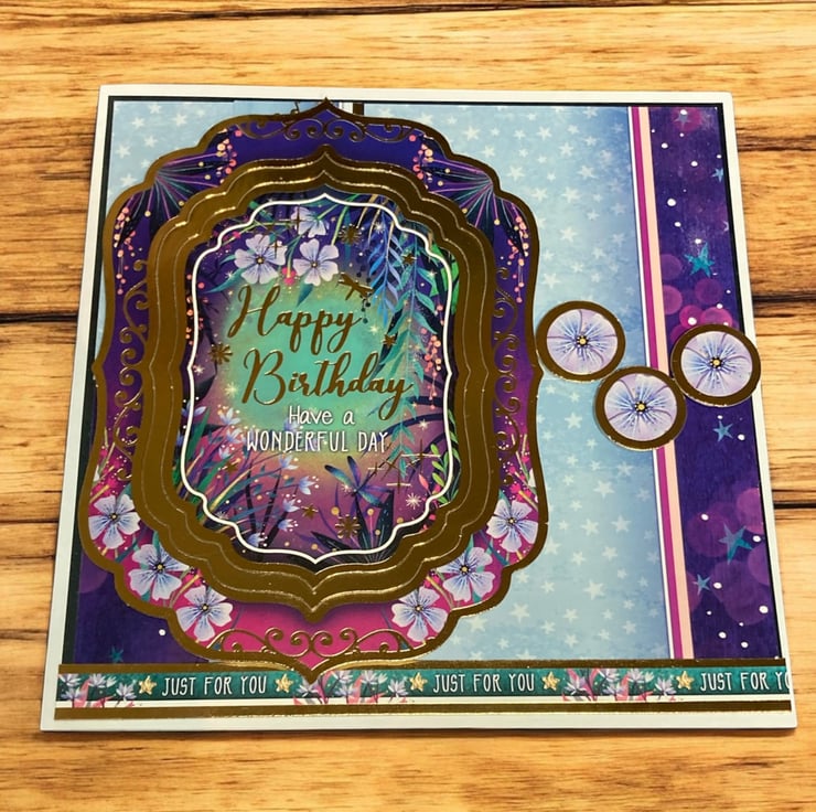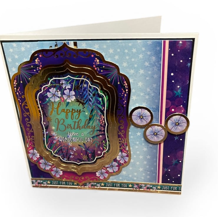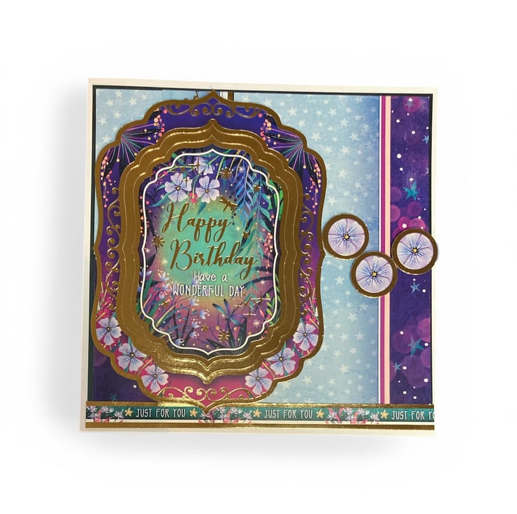 Rich purples, deep blues and delicate florals surround the centre greeting which reads “Happy Birthday – Have a Wonderful Day”. The layered frame detail adds beautiful dimension and elegance, while soft stars and blossoms create a whimsical, storybook feel. Finished with coordinating embellishments and a “Just For You” sentiment strip, this card is perfect for someone who loves something a little extra special.