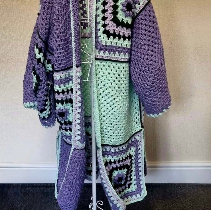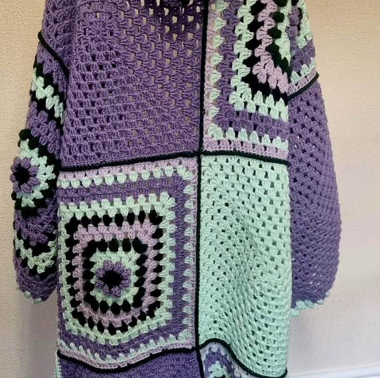 A bold, colorful statement piece featuring lavender and mint tones in a unique granny-square design. Carefully hand-knitted for warmth, comfort, and individuality. Size Uk 20/22