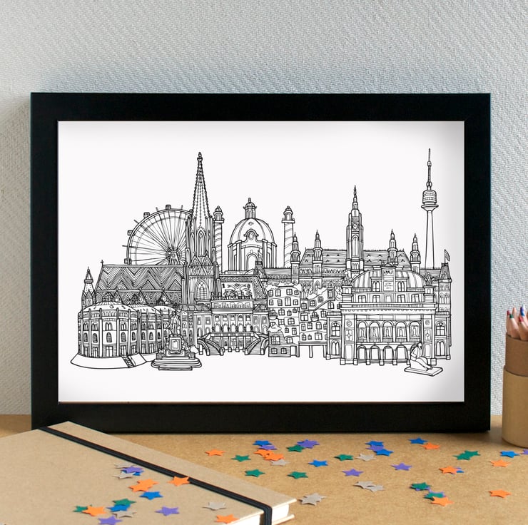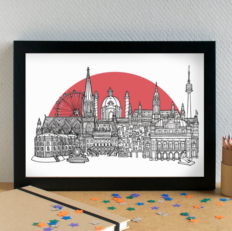 The illustration was drawn using pen and ink, by hand, and has then been digitally manipulated to come up with the final image. It features Stephansdom, Karlskirche, Reisenrad, Rathaus, Donauturm, Schloss Schönbrunn, Staatsoper, the Vienna Gasometers, Hundertwasser Village, a little Mozart monument, and a sculpture of Sigmund Freud.