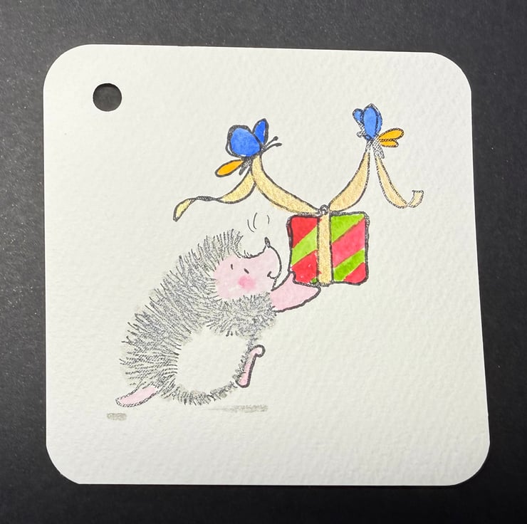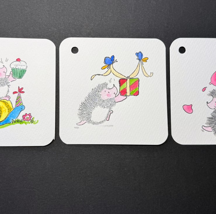 This listing is for a trio of charming hand painted gift tags featuring three different Penny Black's hedgehog characters, each one brought to life with delicate watercolour washes and tiny, expressive details. These much loved hedgehogs are full of warmth and personality; rosy cheeks, soft quills, and that unmistakable Penny Black charm that makes people smile the moment they see them.