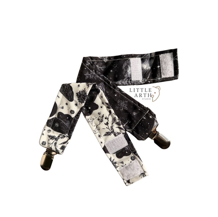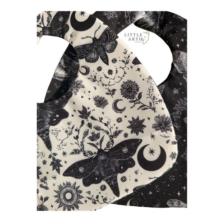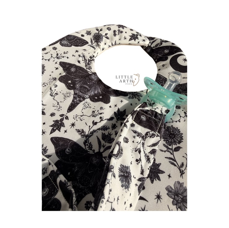 For little ones with big personality. Our handmade gothic-inspired dribble bibs feature an enchanting mix of moths, stars, suns and delicate leaves — perfect for parents who love a darker, alternative aesthetic.