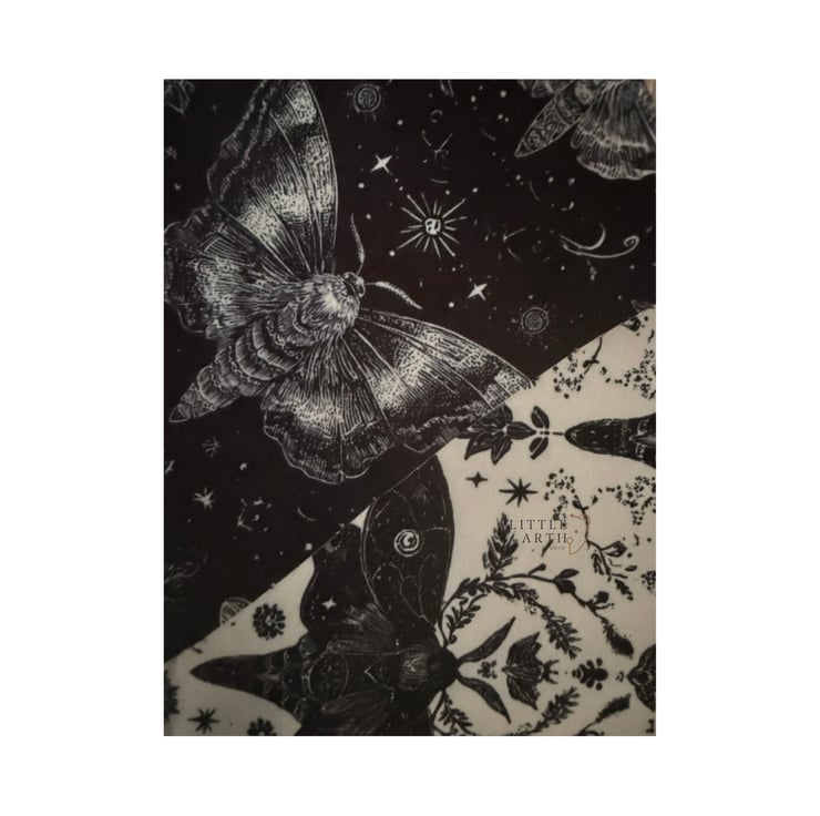 Black fabric with white celestial and moth print