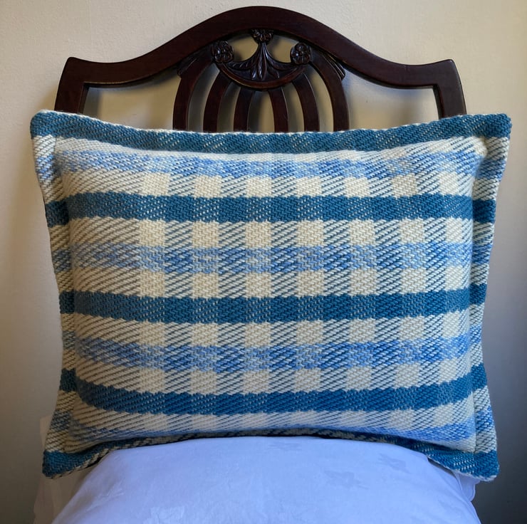 Our wool cloth has been woven in a gingham inspired design. This is our own design and handwoven by us. The reverse has a beautiful good quality teal velvet and zip which is hidden under a flap