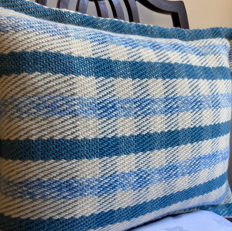 Glenys May Cushion: a mix of Blues, Grey, Ecru