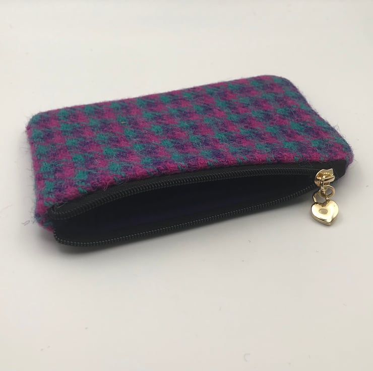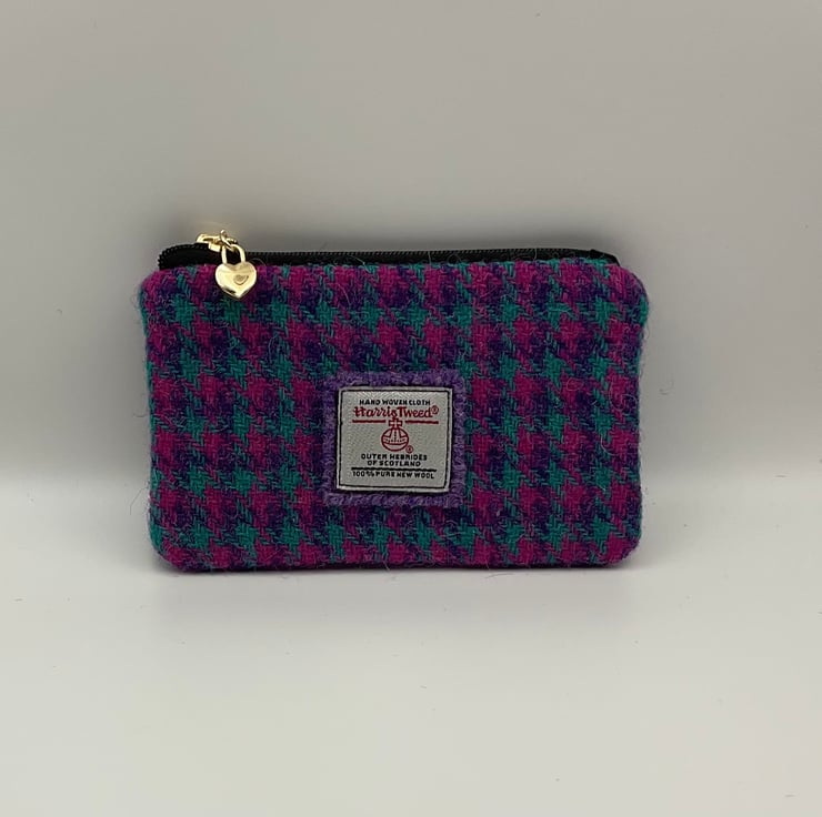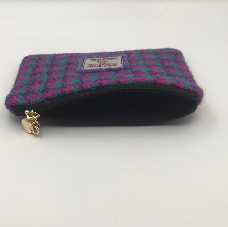 Authentic Harris Tweed fabric zipped coin purse by Ellie’s Handbags with sewn on authenticity label and heart zipper pull