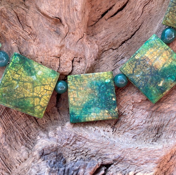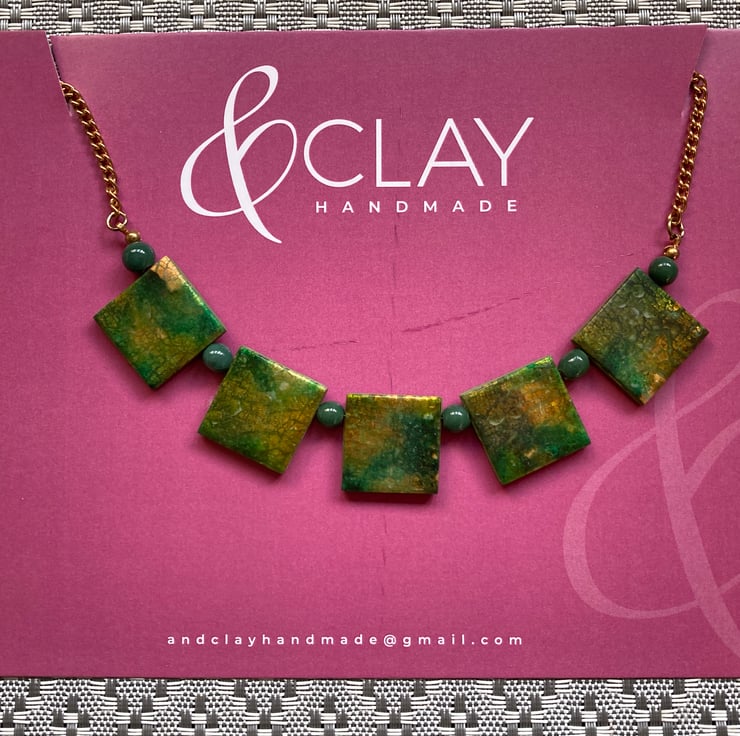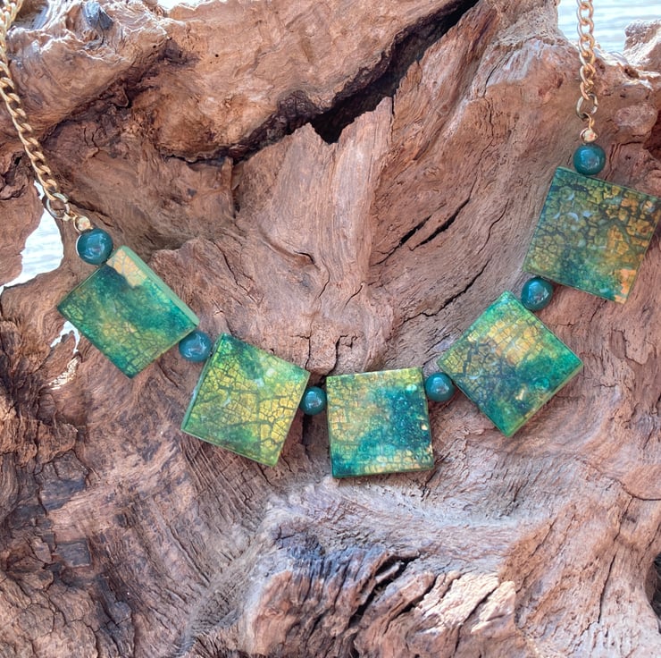 This pretty necklace was made by adding imitation gold leaf to a polymer clay sheet and then enhancing the surface with alcohol inks, creating patterns and effects that are simply beautiful! Gorgeous shades of green and gold giving this piece its rich surface pattern.