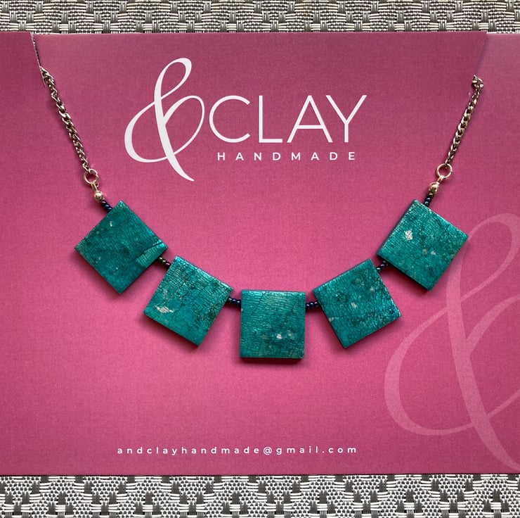 This pretty necklace was made by adding imitation silver leaf to a polymer clay sheet and then enhancing the surface with alcohol inks, creating patterns and effects that are simply beautiful! Gorgeous shades of teal and silver giving this piece its rich surface pattern.