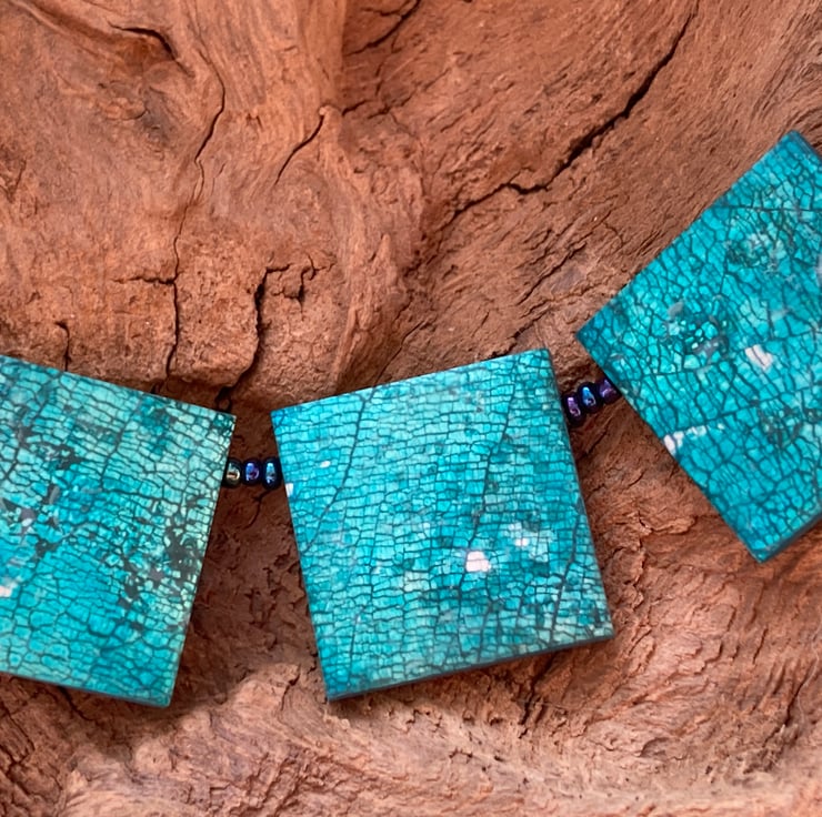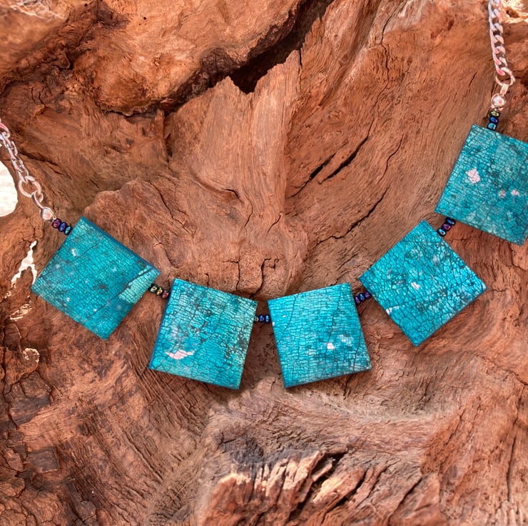 The squares on the necklace are 2cm and separated by glass beads. The total length of the necklace is approximately 48cm (19”), and is strung on a stainless steel chain.