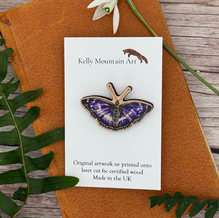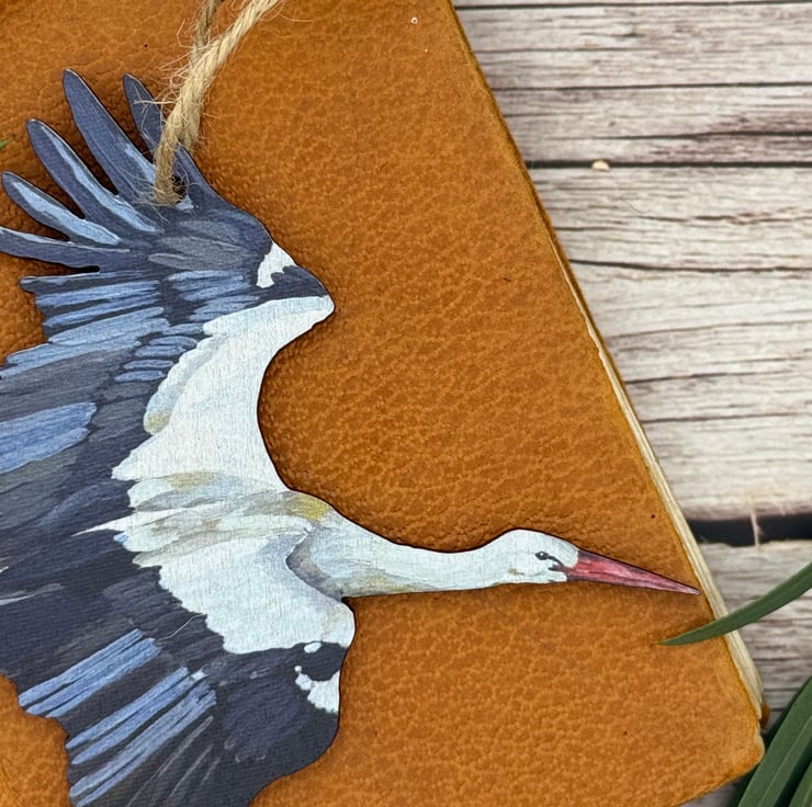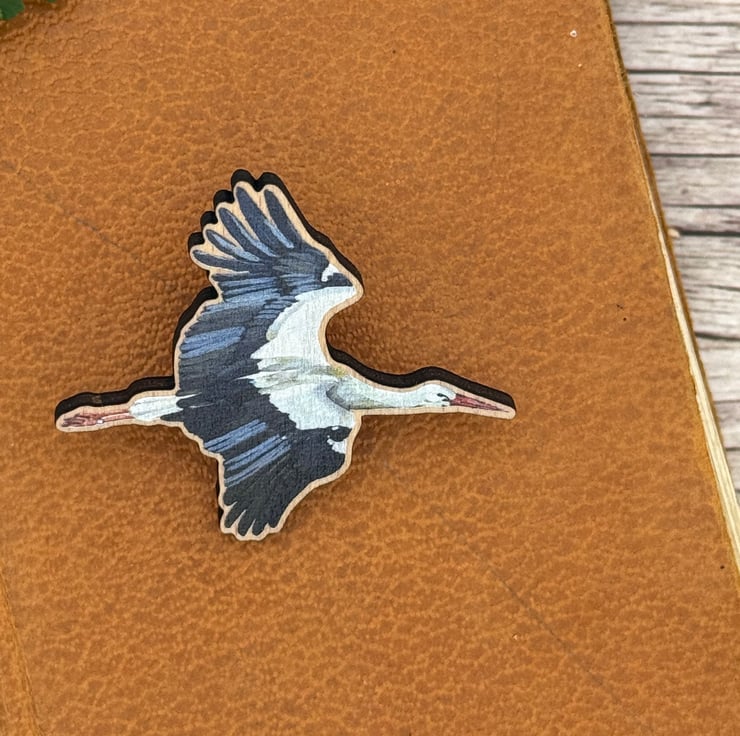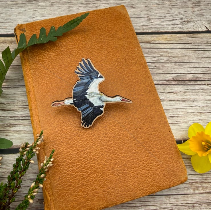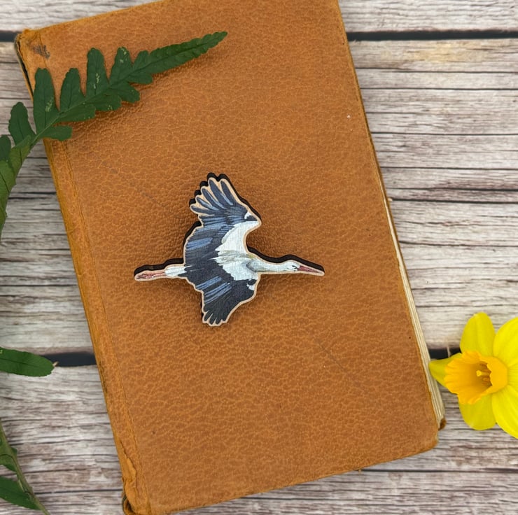 Sustainable wooden pin badge with my unique hand painted White Stork design. This has been uv printed onto fsc-certified plywood and then laser cut around the perimeter of the bird to keep the shape of the bird as part of the design.