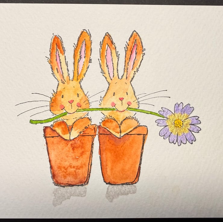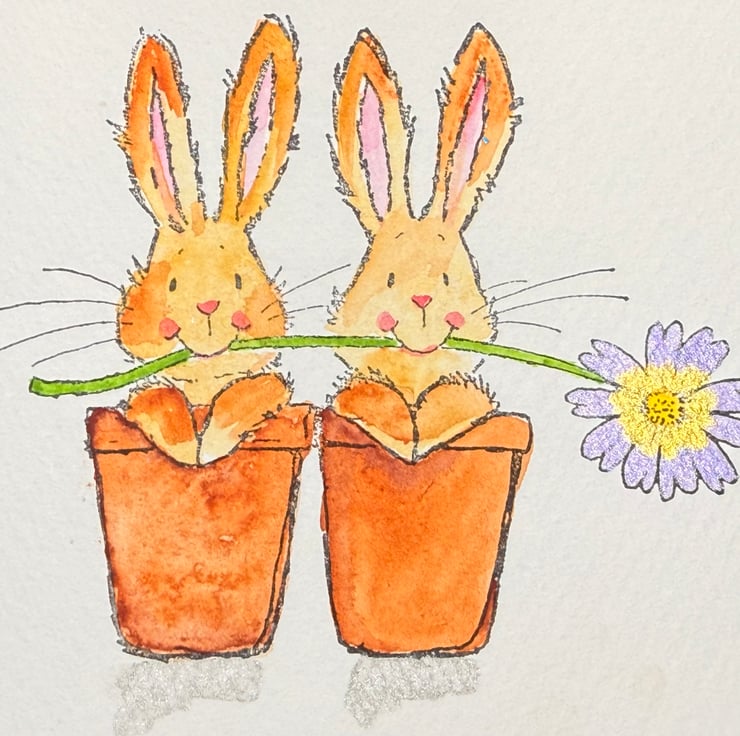1. Two rabbits sitting snugly in flowerpots, full of gentle humour and springtime sweetness.