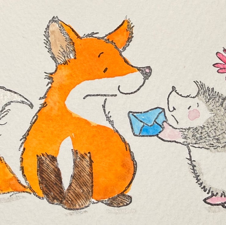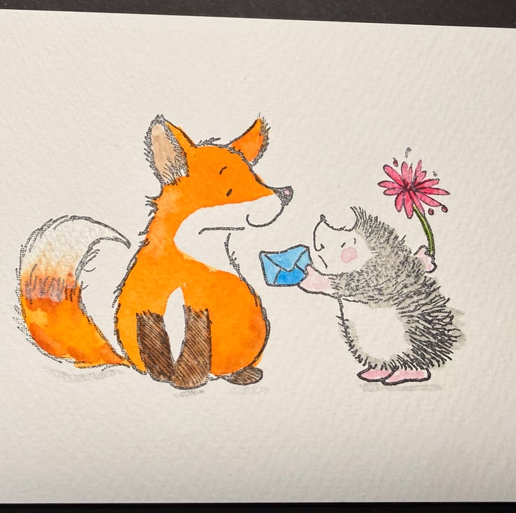 3. A hedgehog delivering a card to a fox, a tender moment of woodland friendship.