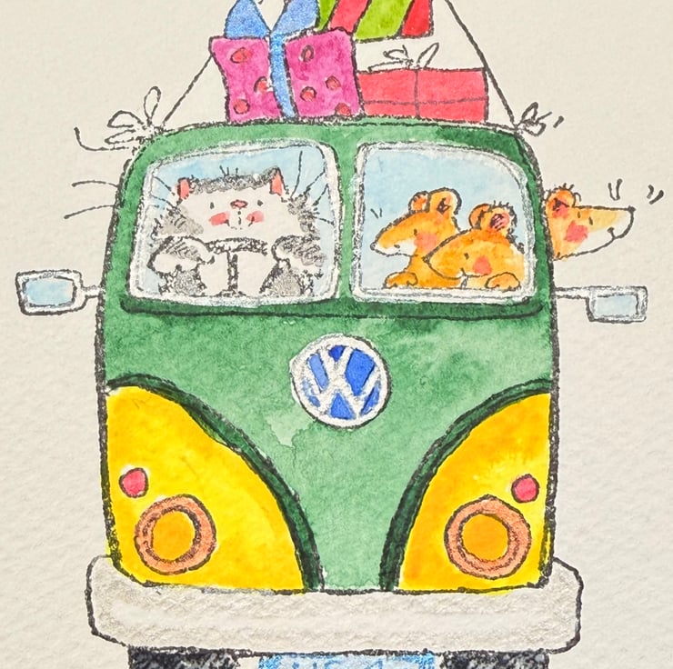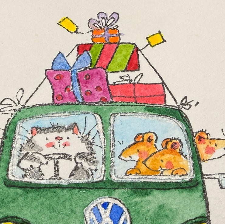 These illustrations begin with a moment of quiet focus. I sit with the soft Penny Black outlines — the rabbits peeking from their flowerpots, the woodland friends packed into their campervan, the hedgehog delivering a tiny card to the fox — and let the brush bring them gently to life. Painting them helps me slow down and settle into a calmer rhythm, and each card becomes its own little story. There’s something soothing about creating these gentle, character‑filled scenes, and I hope they carry that same sense of warmth and kindness to whoever receives them.