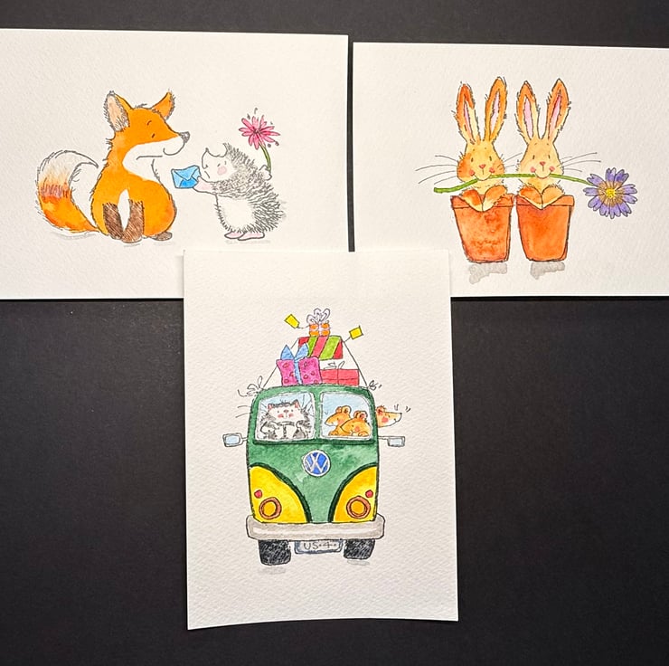 This listing is for acharming set of three hand painted cards featuring three different Penny Black illustrations, each one stamped with original rubber stamps and brought to life with soft, expressive watercolour.