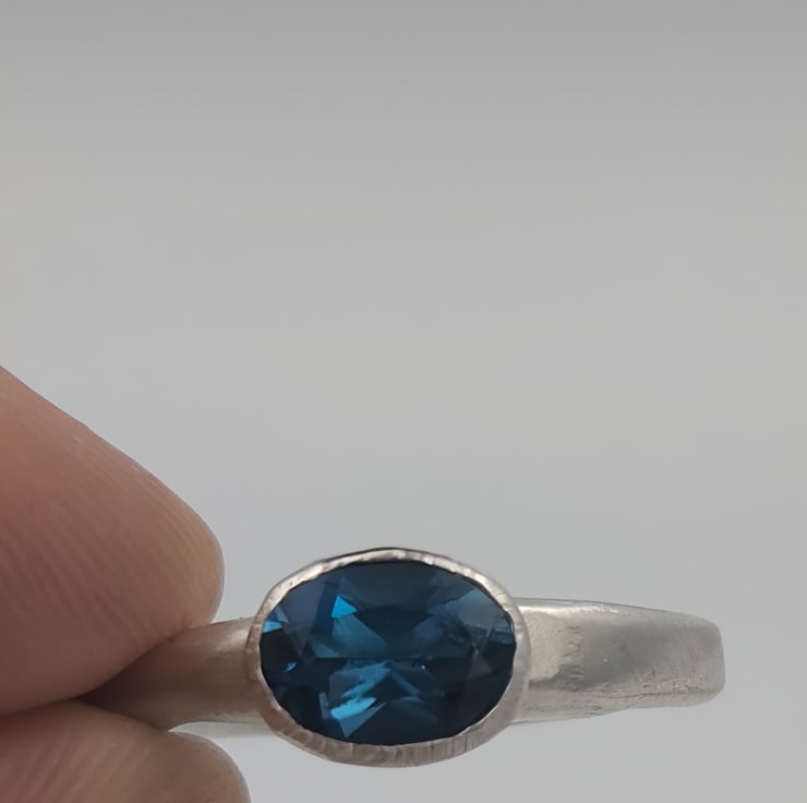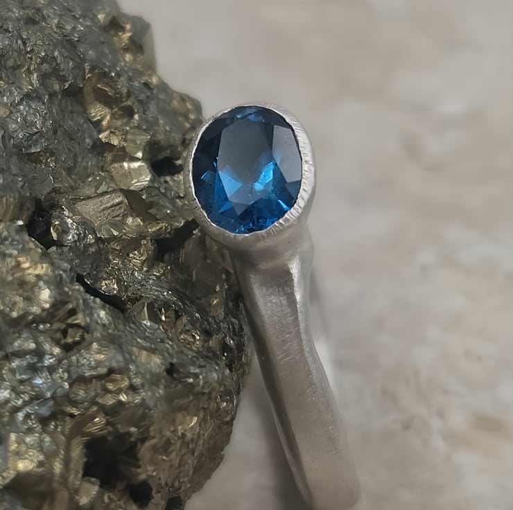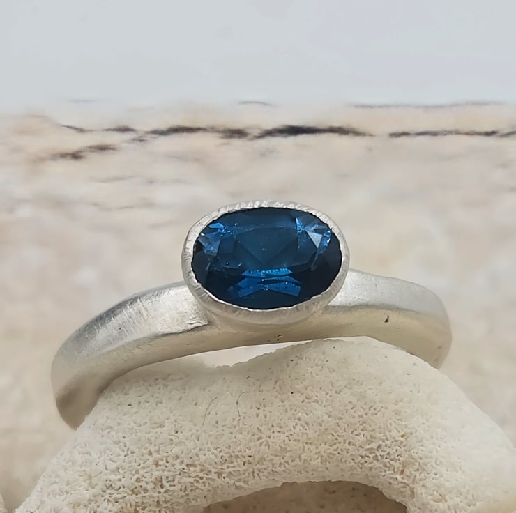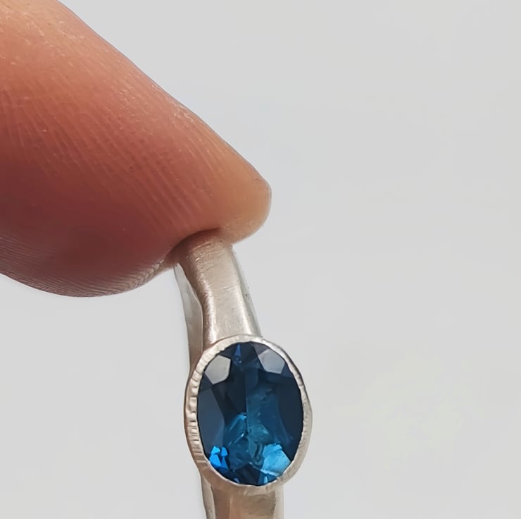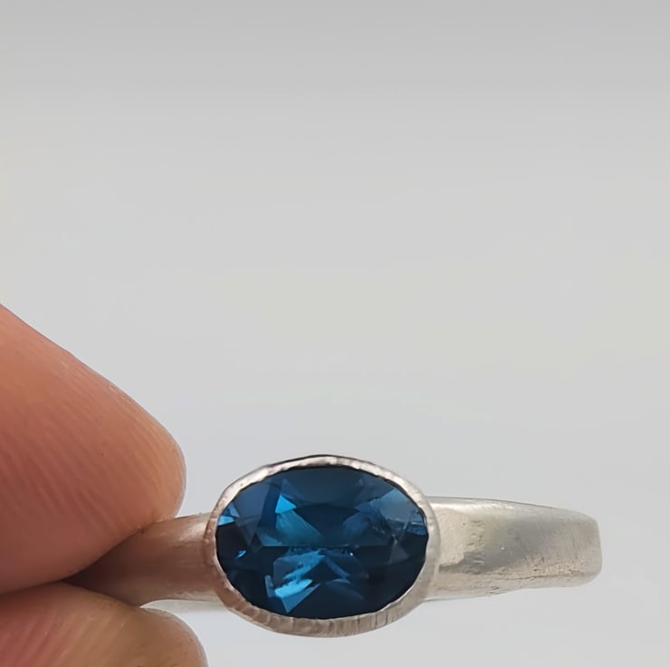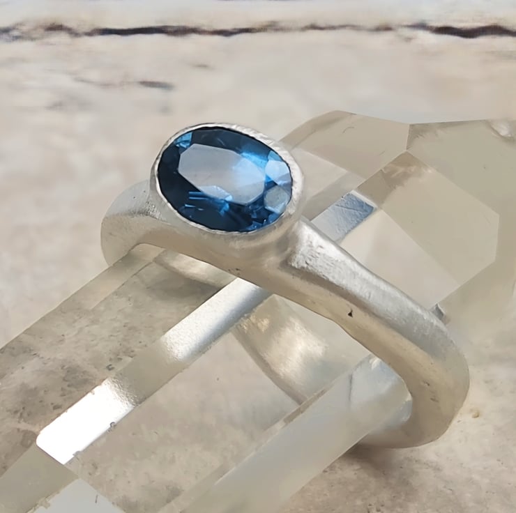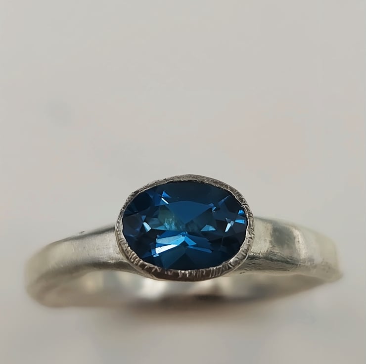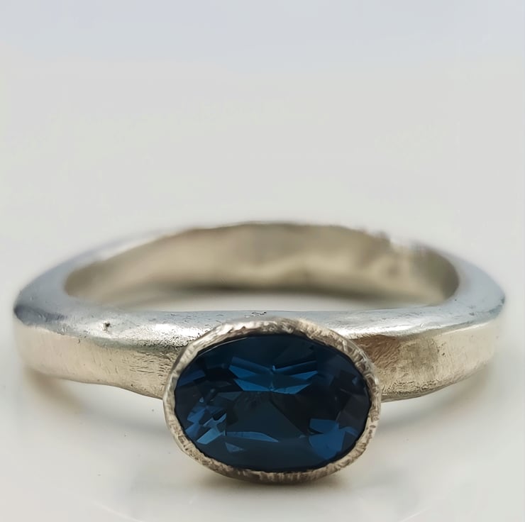 Discover the elegance of a hand-forged sterling silver ring adorned with a mesmerising London blue topaz. This unique piece radiates timeless beauty and craftsmanship, perfect for any special occasion.
