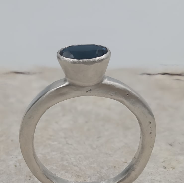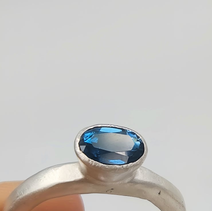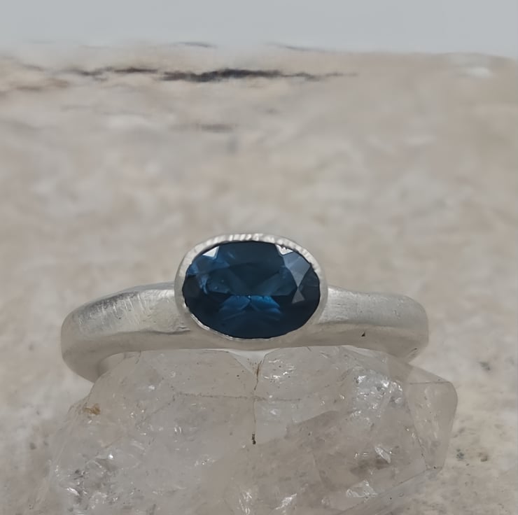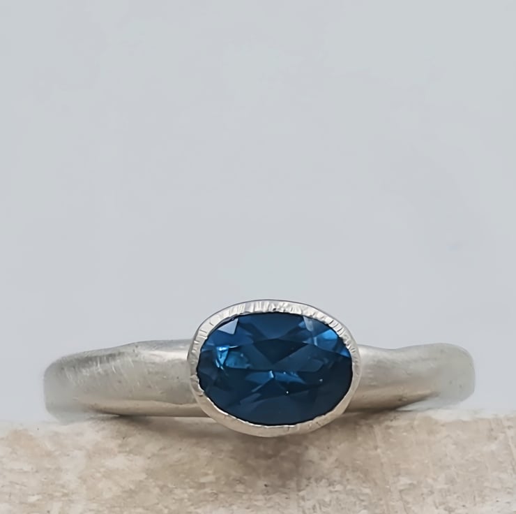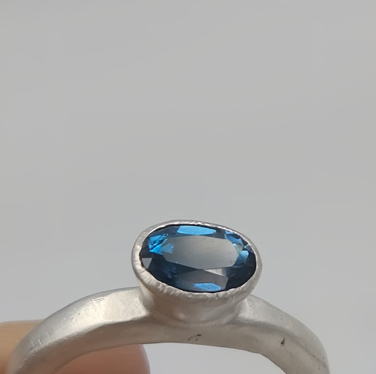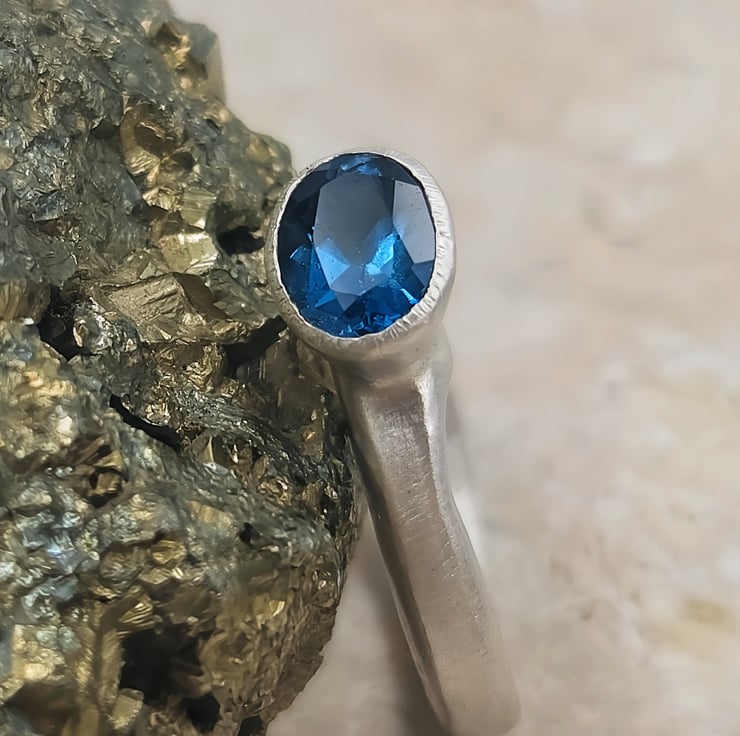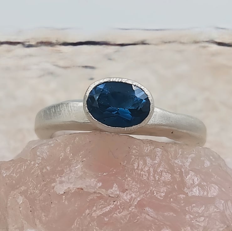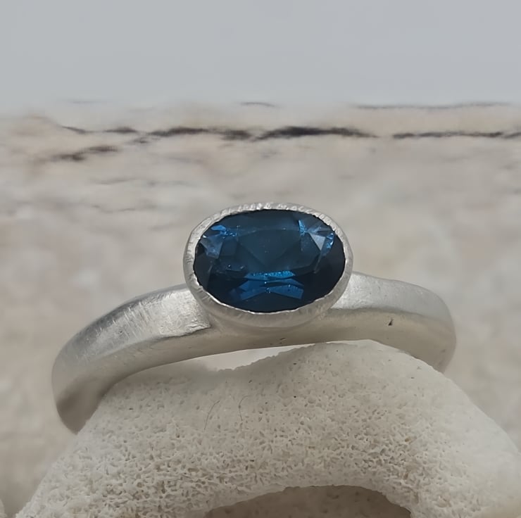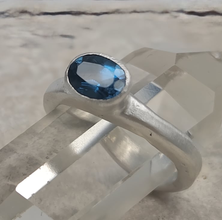 Discover the elegance of a hand-forged sterling silver ring adorned with a mesmerising London blue topaz. This unique piece radiates timeless beauty and craftsmanship, perfect for any special occasion.