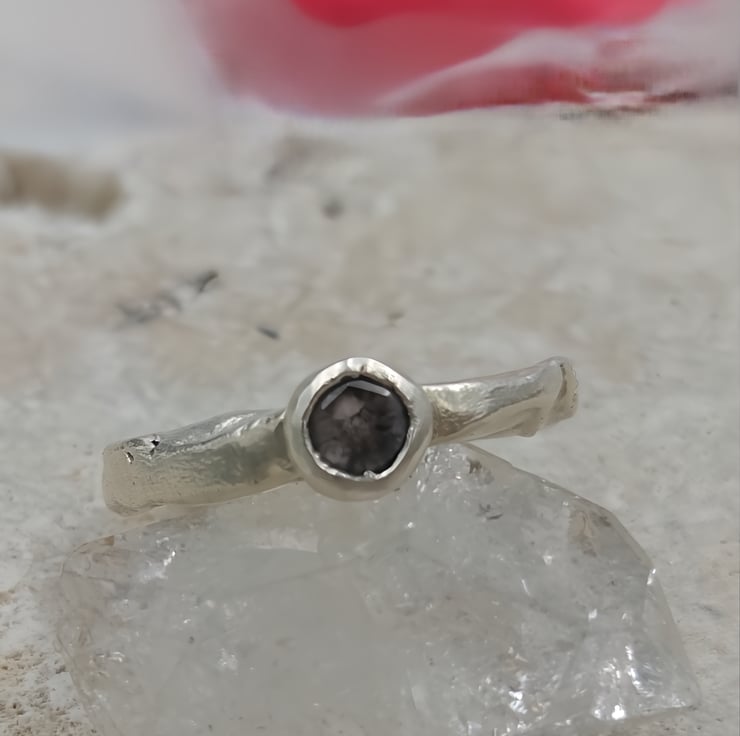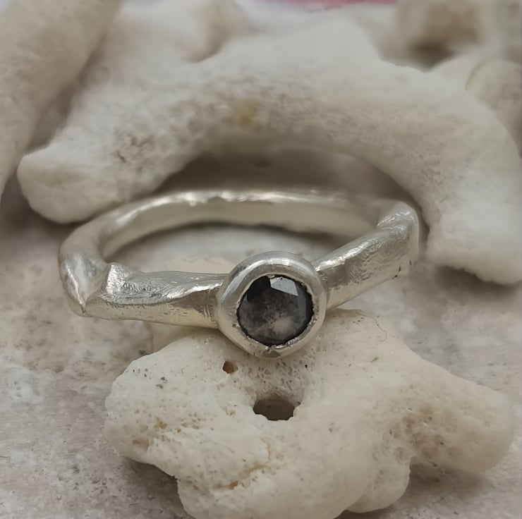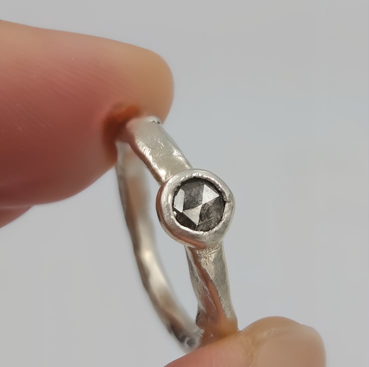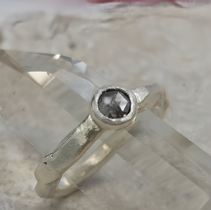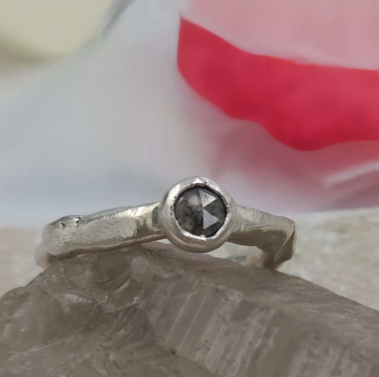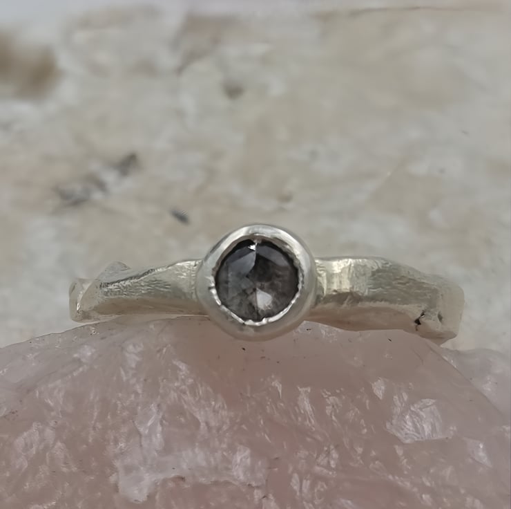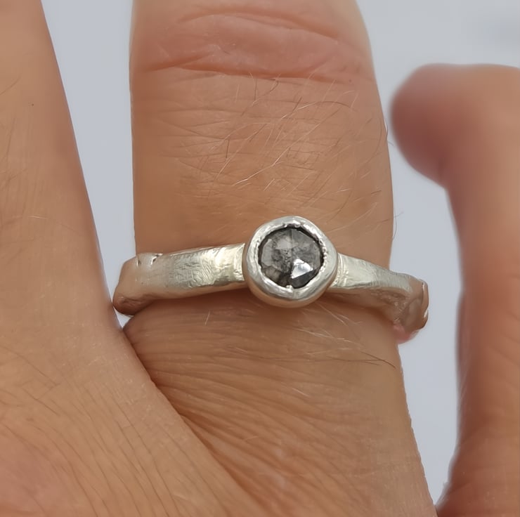 A one-of-a-kind 4.6mm rose cut salt & pepper diamond set in molten recycled silver. Unique, handmade engagement ring full of natural, organic beauty.
