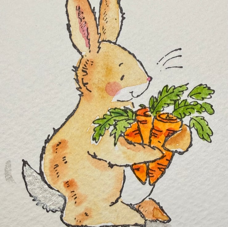 These little scenes begin with a moment of quiet focus. I sit with the soft Penny Black outlines — the dog drifting upward on his heart balloon, the hedgehog peeking from a flowerpot, the rabbit proudly holding his carrots — and let the brush bring them gently to life. Painting them helps me slow down and settle into a calmer rhythm, and each postcard becomes its own tiny story. There’s something soothing about creating these cheerful characters, and I hope they carry that same sense of warmth and lightness to whoever receives them.