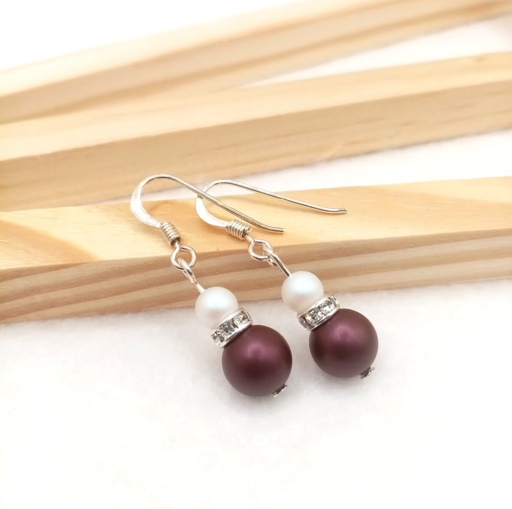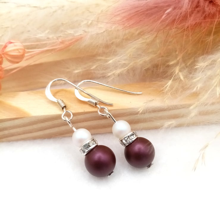 Serinity crystal pearl drop earrings in elderberry/dark purple with iridescent white crystal pearls and 925 sterling silver ear hooks.