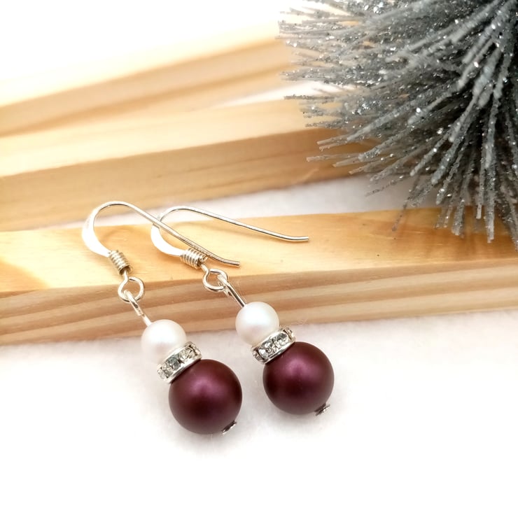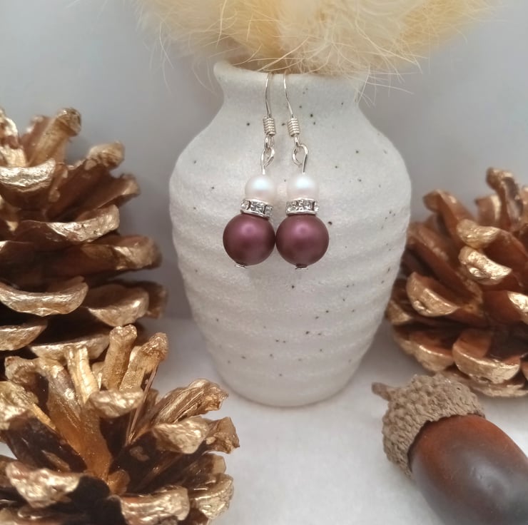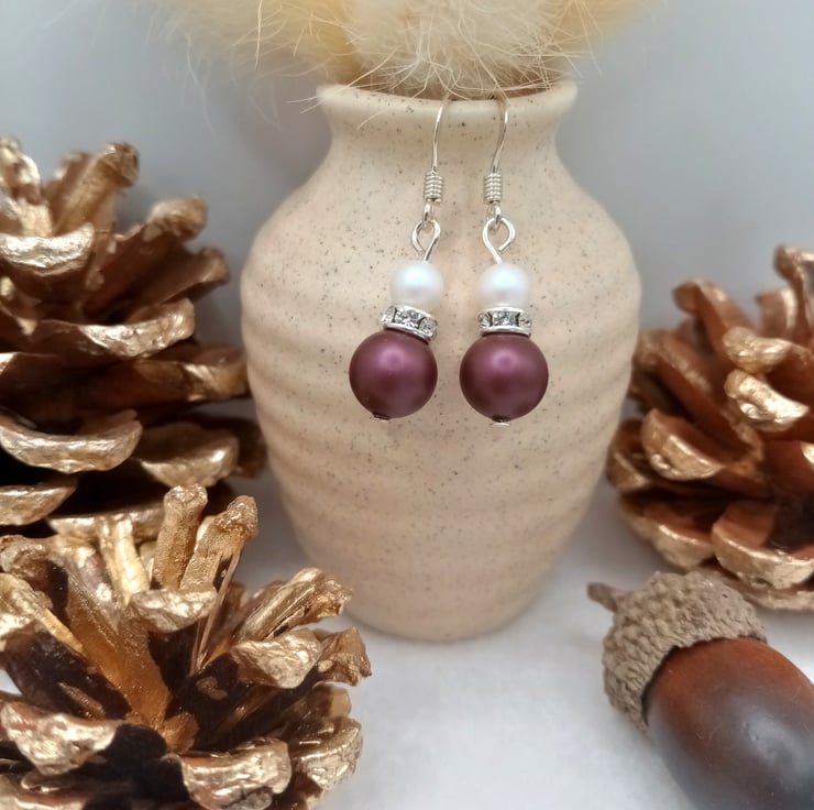 These stunning crystal pearl dangle earrings are handmade using 8mm Serinity Austrian crystal pearls in elerberry and 6mm iridescent white Serinity Austrian crystal pearls with 4.5mm silver plated Preciosa diamanté crystal rondelles.