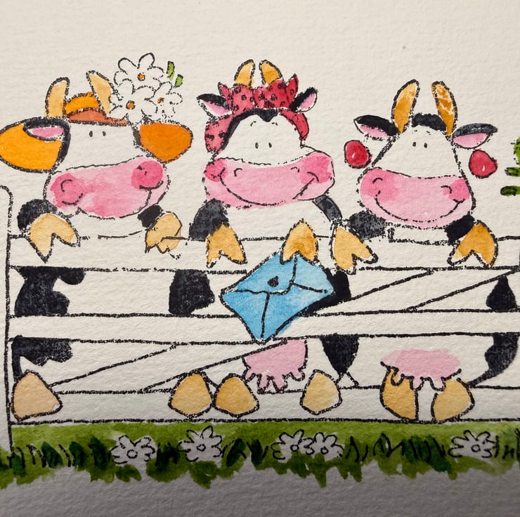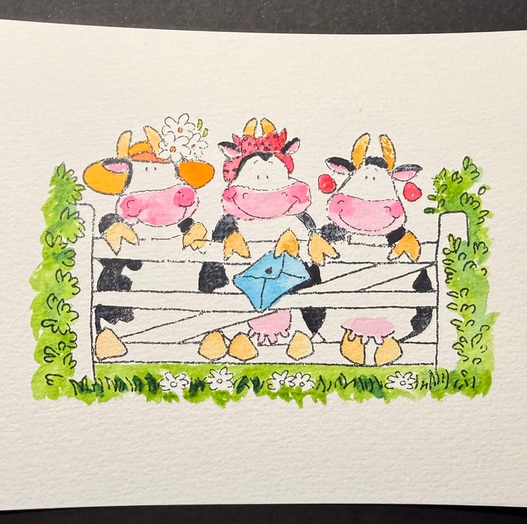 This listing is for a delightful hand painted illustration featuring three Penny Black cows leaning over a wooden fence, each one with its own expressive face as if sharing a bit of friendly gossip. Painted by hand on 140 lb NOT (Cold Pressed) watercolour paper, this piece measures 10.5 x 14.6 cm and is full of soft colour, gentle shading, and playful detail.