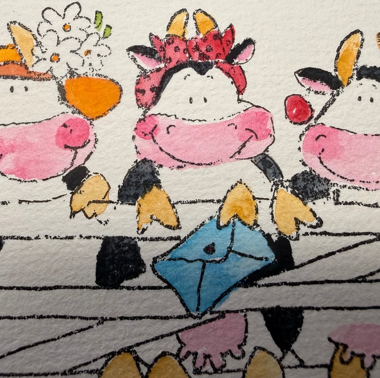 This little scene began with a moment of quiet focus. There’s something wonderfully comforting about these three cows — leaning over the fence as if sharing a secret, each one with its own gentle expression. Painting them on NOT paper lets the colours settle softly, giving the scene a warm, rustic calm. Each cow adds its own charm, and together they create a tiny story of friendship, curiosity, and everyday countryside magic. I hope it brings that same sense of warmth and humour to whoever holds it.