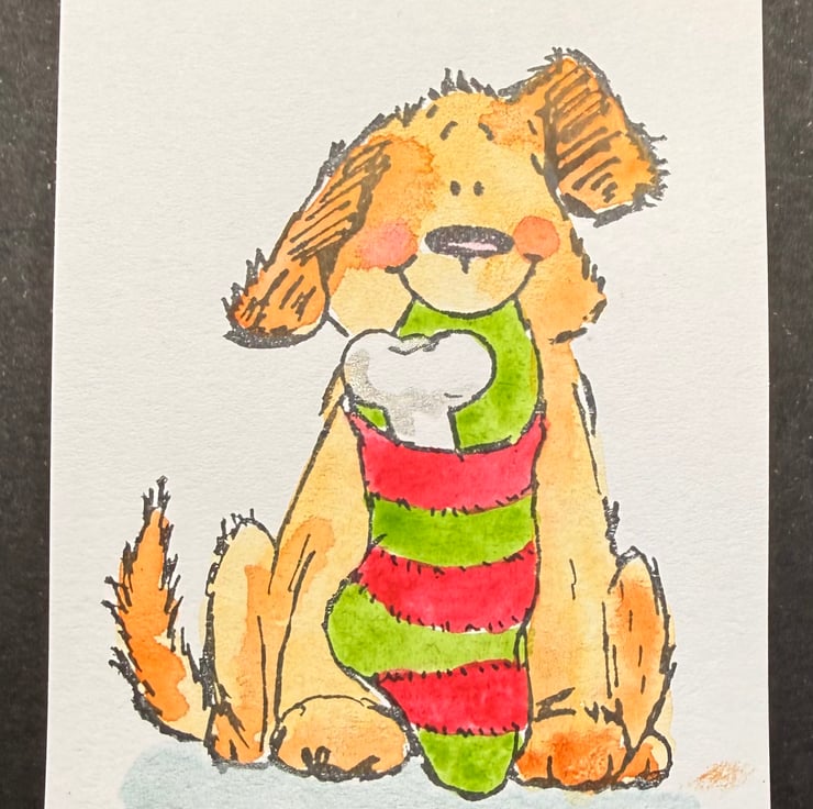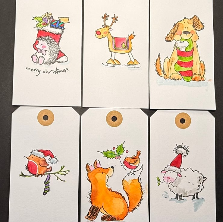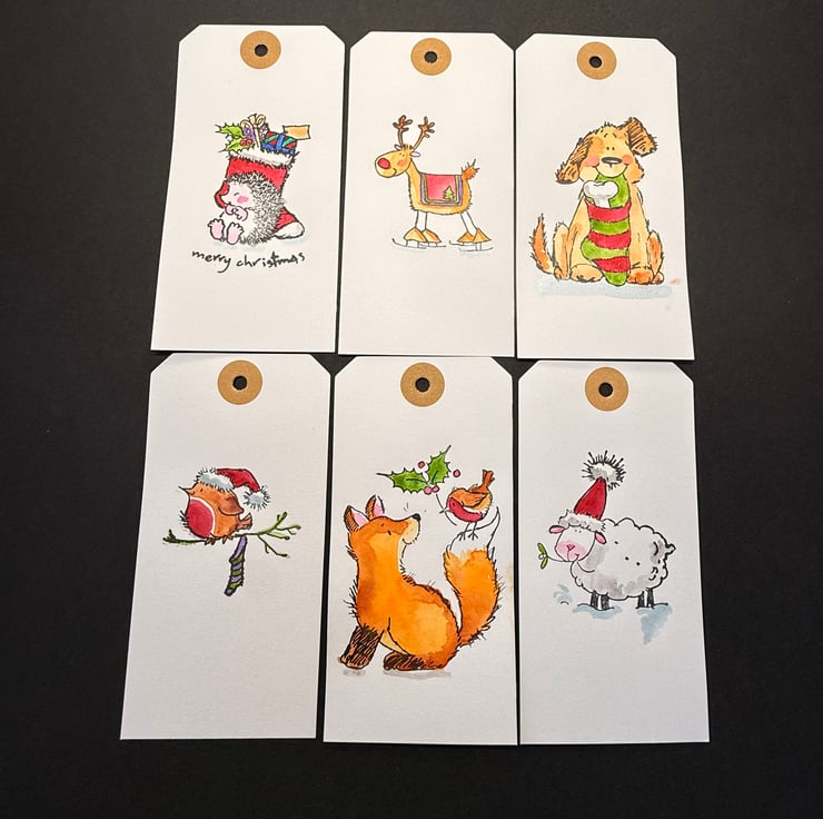 This listing is for a joyful set of six hand painted Christmas parcel tags featuring six different Penny Black festive illustrations, each one stamped with original rubber stamps and brought to life with soft, expressive watercolour. Every tag is painted on medium 12.5 x 6 cm cardstock and finished with a reinforced hole punch, making them sturdy, durable, and ready to tie onto gifts.