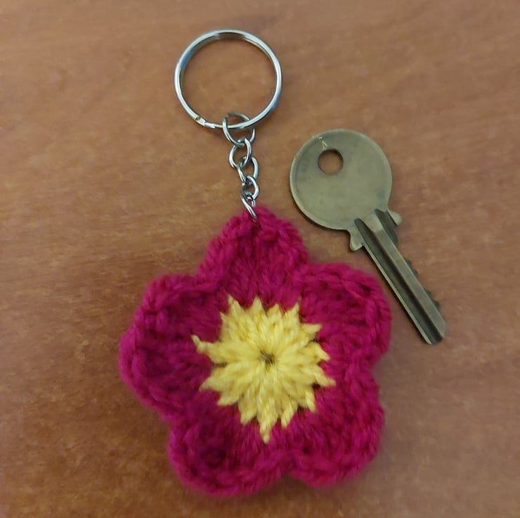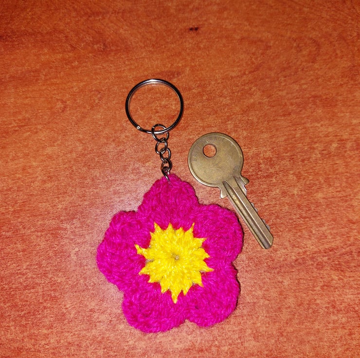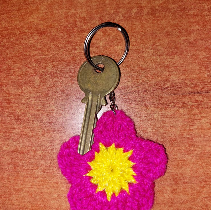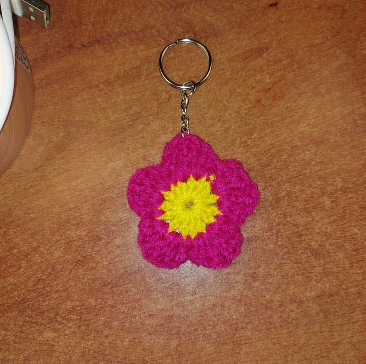 The item is a handcrafted, crocheted flower with five magenta-pink petals and a bright yellow center made using yarn saved from landfill creating a 2 colour medium size keychain.