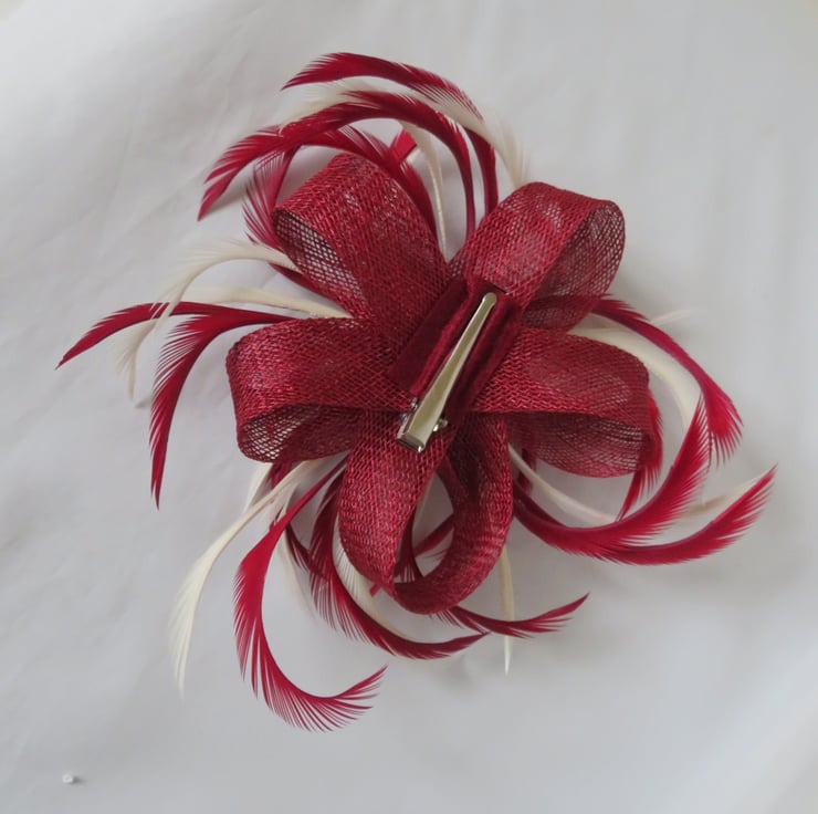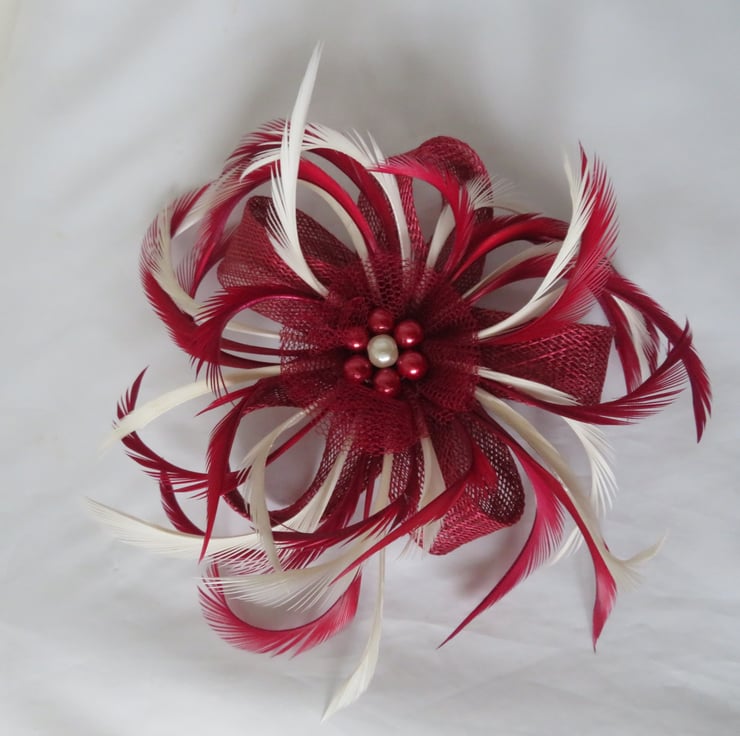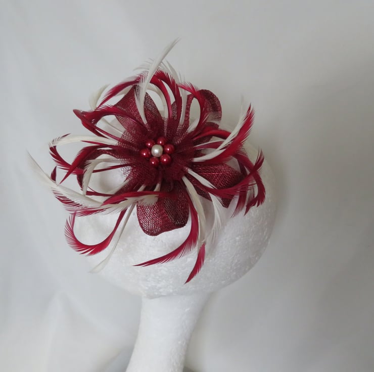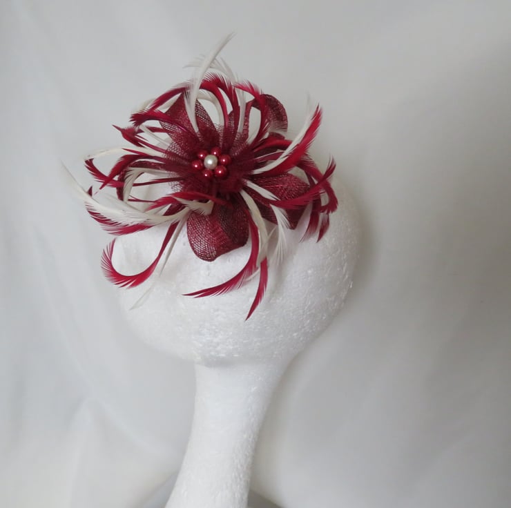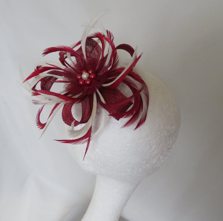 This is an attractive sinamay loop fascinator in shades of burgundy and ivory.