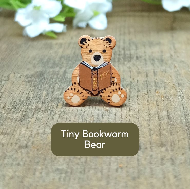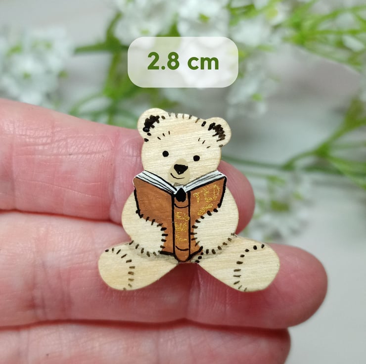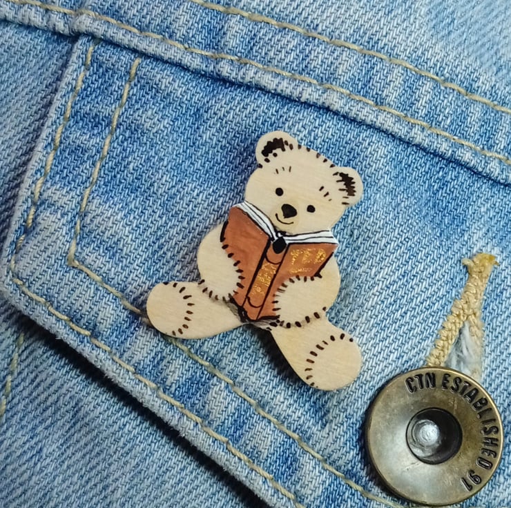 Bookworm Bear Pin, Handmade Wooden Teddy Badge, Gift For Book Lover