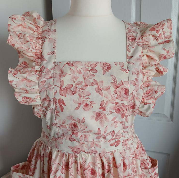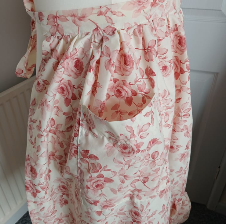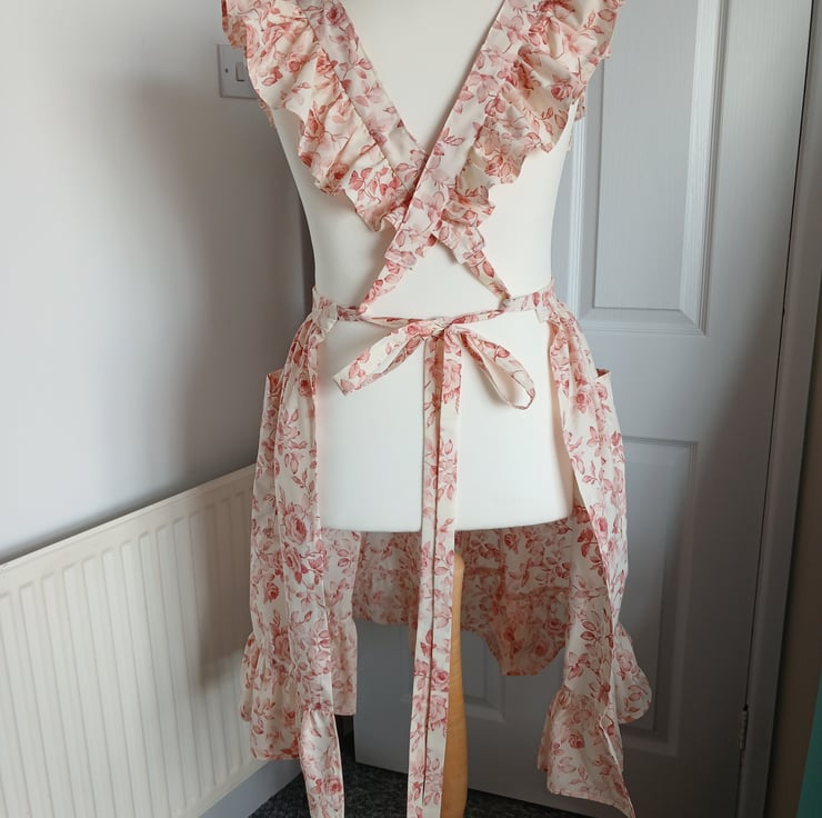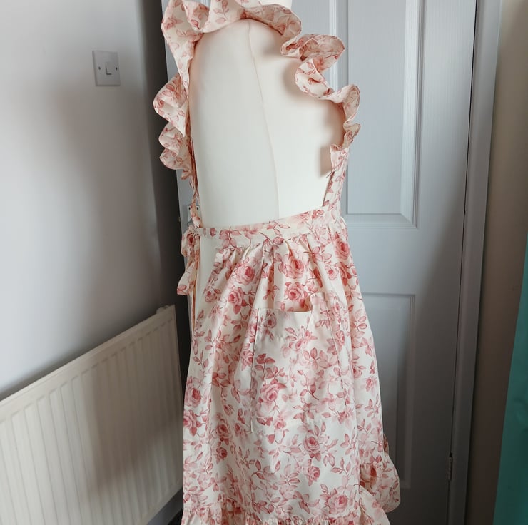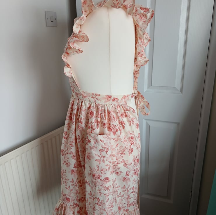 Traditional cross back apron, handmade using a vintage floral fabric. Apron measures 26cm from bib edge to waist and 70 cm from waist to hem. tie straps are approx 1.5 metres in length
