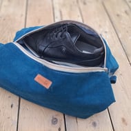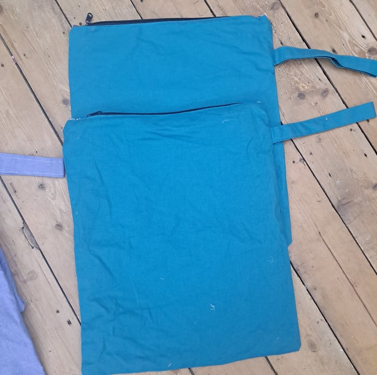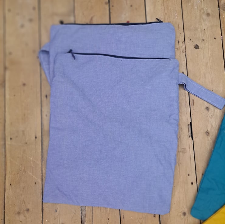 You'll always find a use for these wet bags. The outer fabric is plain cotton and the lining is waterproof fabric in various colours. As the bag is stitched together it is not entirely waterproof as a plastic bag would be but these bags are used for wrung out swimming kit, gym and sports kit, used bibs etc to be transported home for washing. You can also put one in the kitchen for washable dish cloths or in the bathroom. Larger than normal wet bags at aproximately 40cm high by 35 cm wide. The lining can be pulled to the outside for drying and shown in the picture. They can be washed on 40 deg and line dried. They have all been hand made by me in my home studio near chester on my vintage sewing machine. They have a handy carry or hanging strap and all feature matching or contrast zip ends.