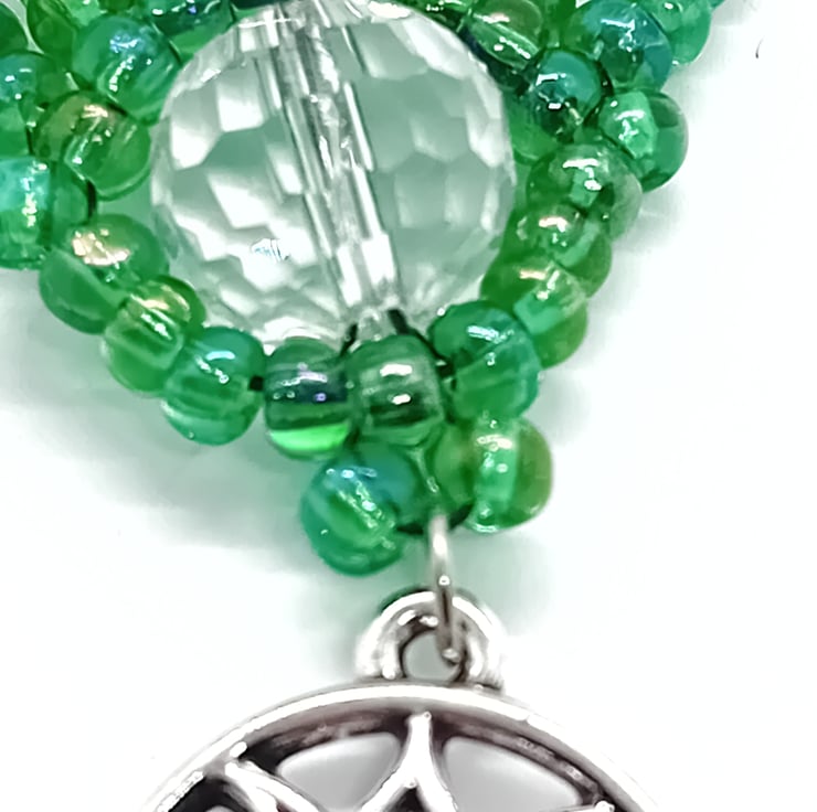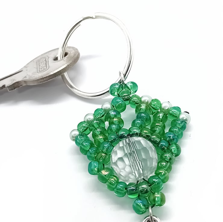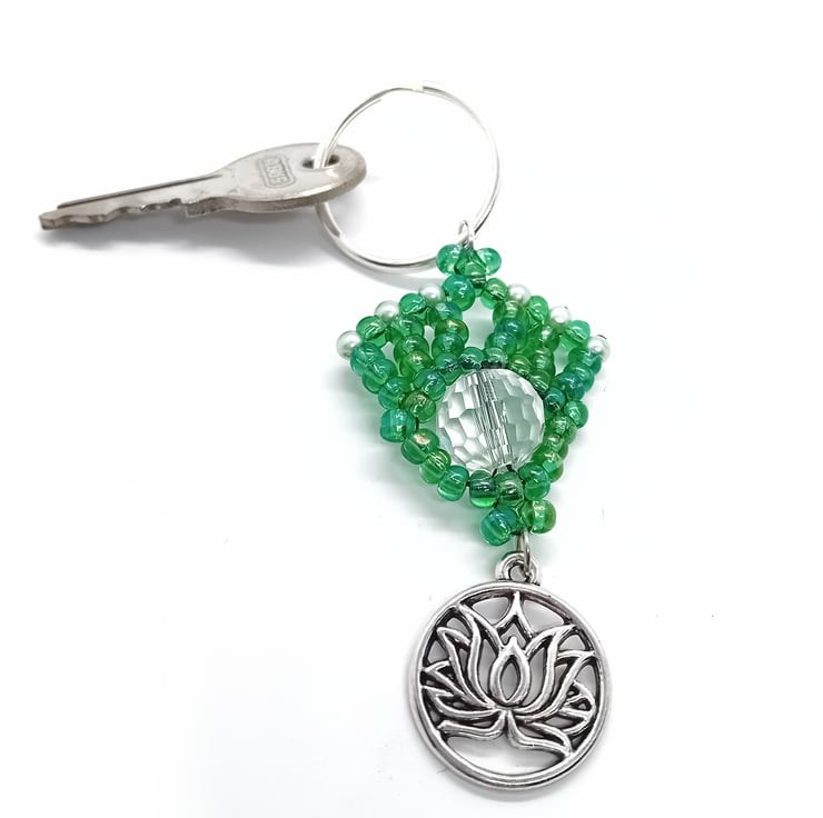 This green beaded lotus charm keyring has been made with green shimmering beads, silver beads, and a metal plated lotus charm.