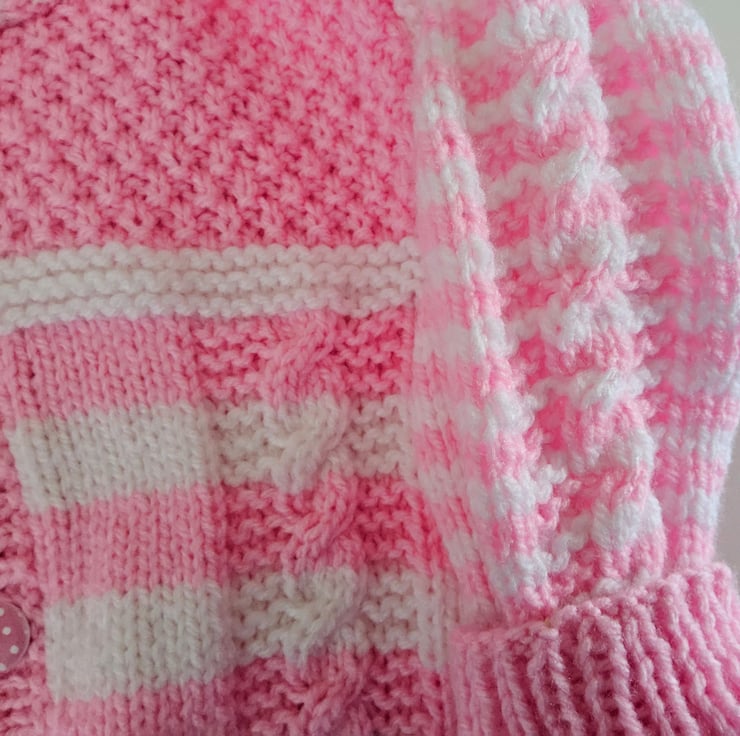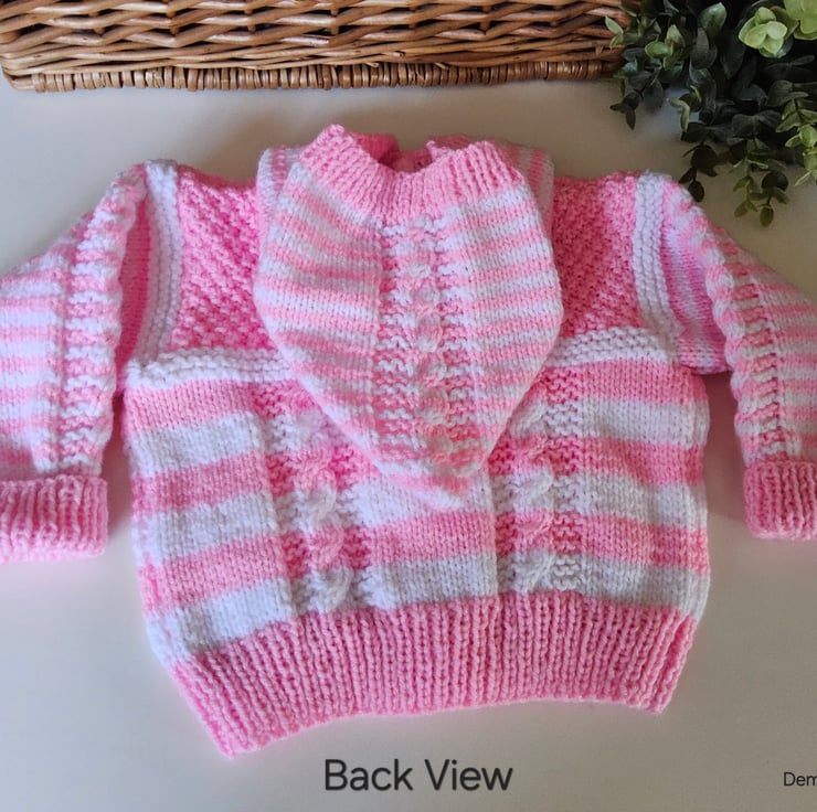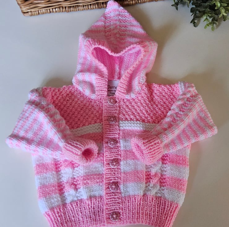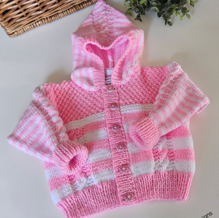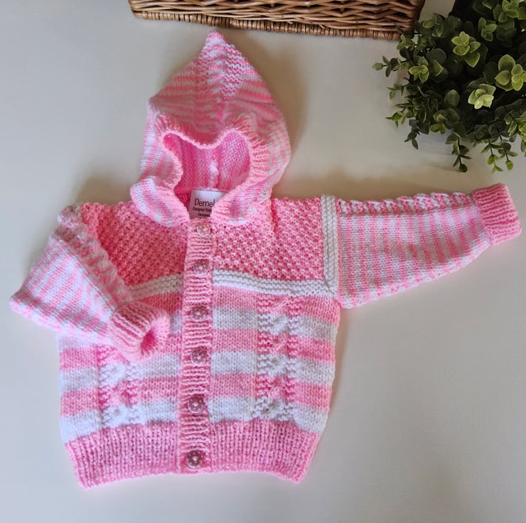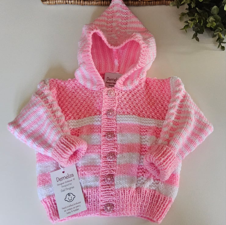 A practical designer baby girl's hand knitted textured and cable hooded jacket for those seeking total individuality. It will make a perfect genuine designer baby gift for a new born, baby shower, expecting congratulations gift or for perants looking for quality unique baby knitwear for their little one.