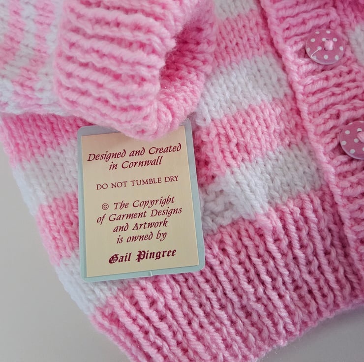 Baby knitwear is designed and hand crafted by Demelza Designs in Cornwall meeting UK baby safety standards, Only branded premuim acylic, acrylic/natural fibre blends or pure natural fibre yarns are used in baby knitwear which conforms to BS984/76 standards.