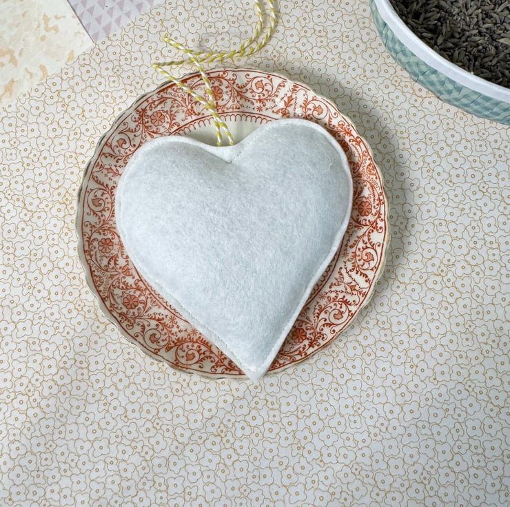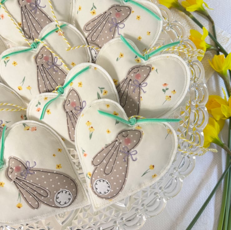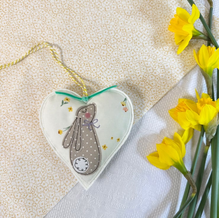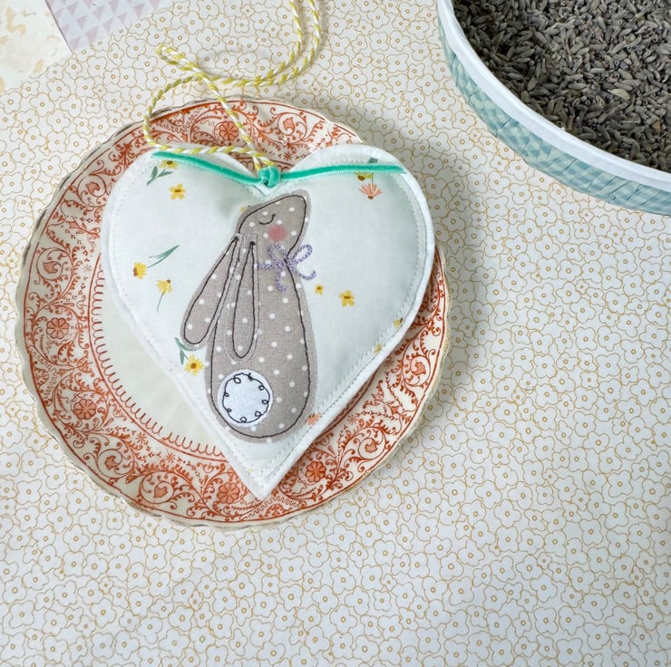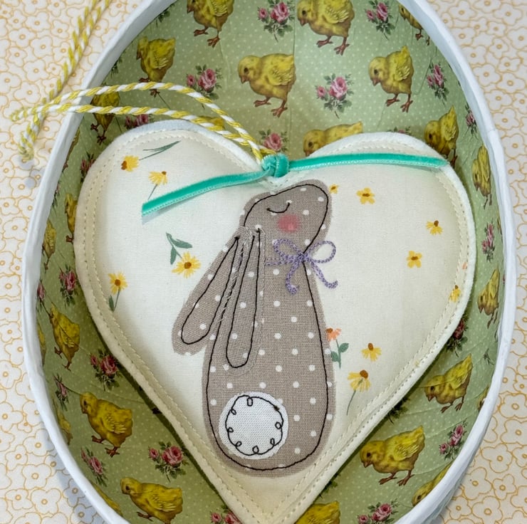 I’ve made a sweet lavender heart decoration to treasure. Using free motion embroidery onto white pastel heart print cotton fabric, a little polka dot bunny sits in the center, complete with rosy cheeks. The heart is wool felt backed.