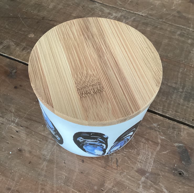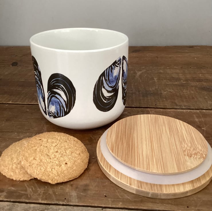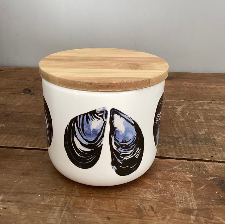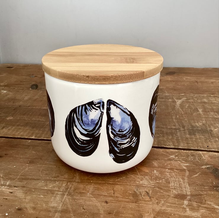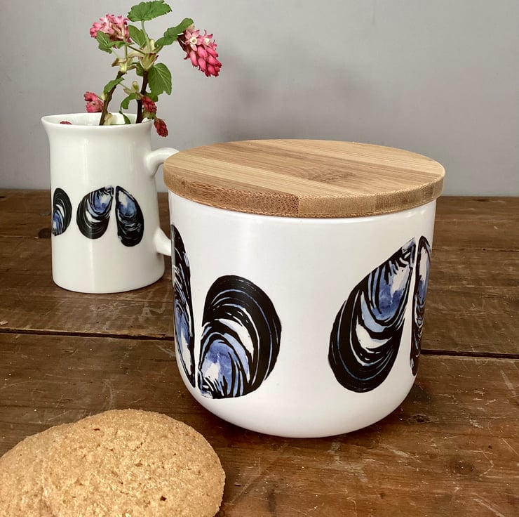 The mussel design is taken from one of my original lino cuts with added watercolour, and is inspired by my coastal Cornish home. The design is printed onto decals, which are applied by hand and then fired in my kiln