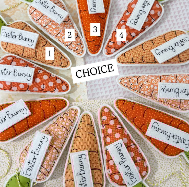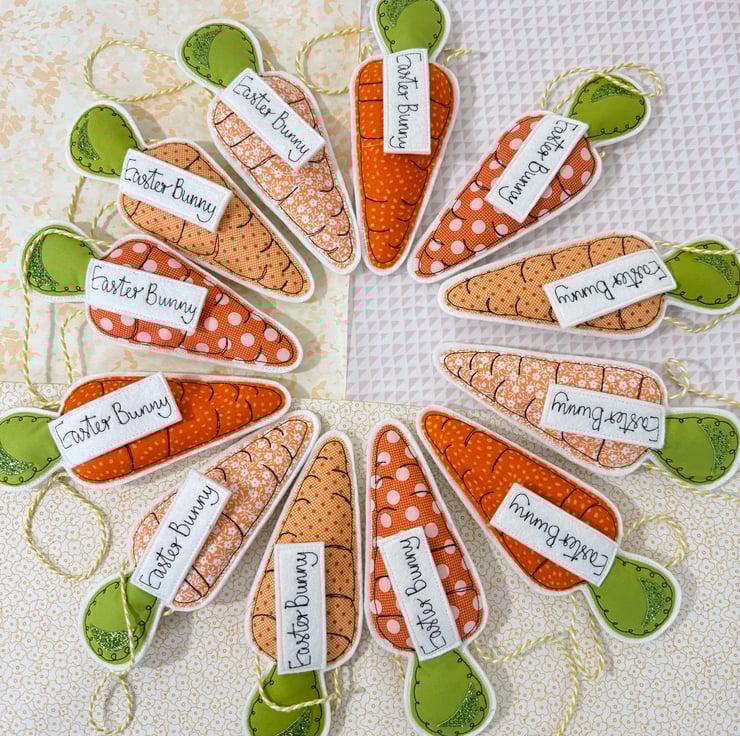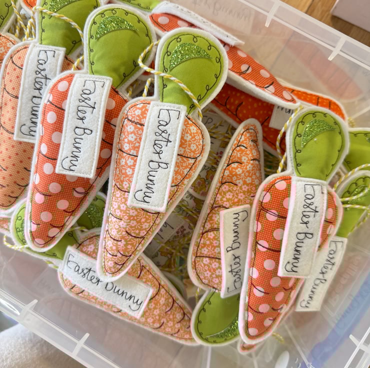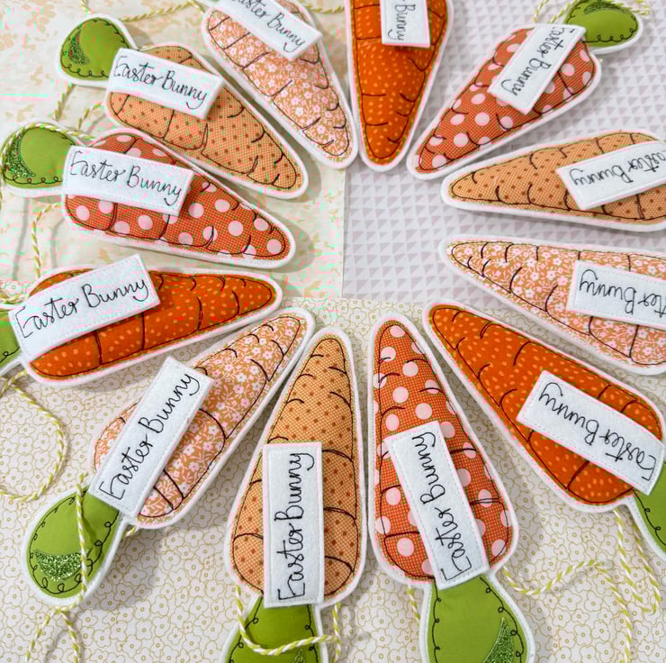 I’ve made a sweet lavender carrot decoration to treasure. Using free motion embroidery, this little carrot is especially for none other than the Easter Bunny themself! It has a name tag and yellow bakers twine for hanging.