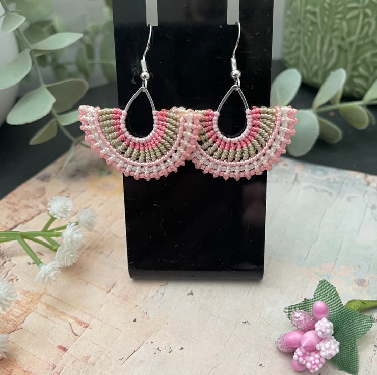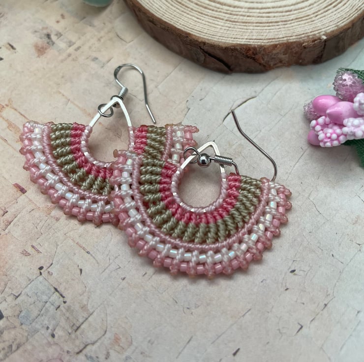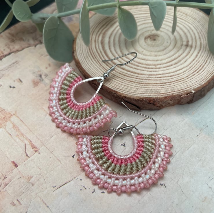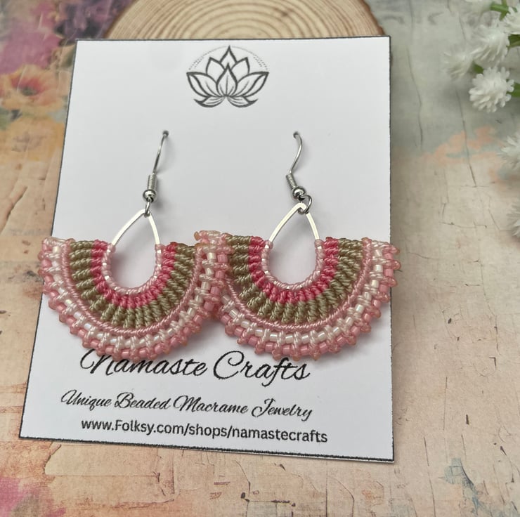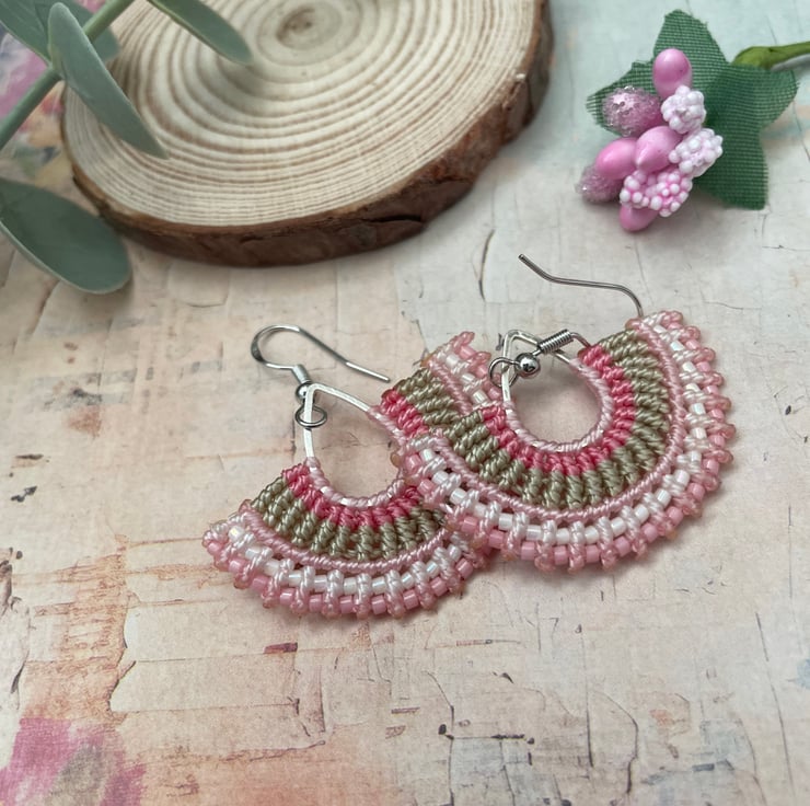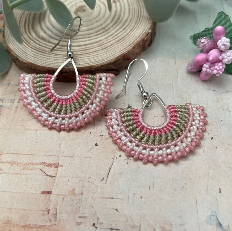 Add a soft boho touch to your outfit with these handmade micro macrame beaded earrings. Carefully crafted with delicate knotting and tiny glass seed beads, these earrings feature a beautiful fan shape with pastel tones of pink, micro macrame thread.