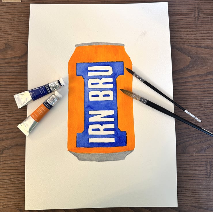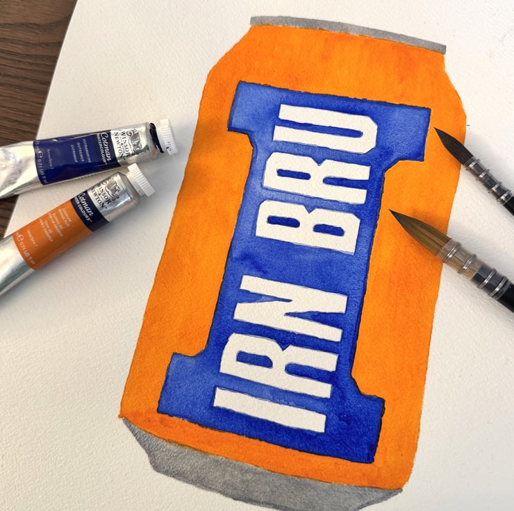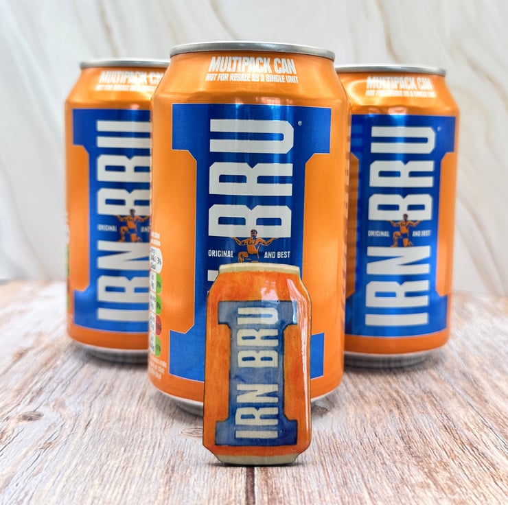 This is my version of the Irn Bru can as a lovely, shiny pin badge. The image has been scanned from my watercolour painting, edited before printing and pressing using a sublimation heat process onto 3mm maple plywood. These are then laser cut into the shape of a can before I hand finish the magnet with UV resin and attaching a pin fastener to the back.