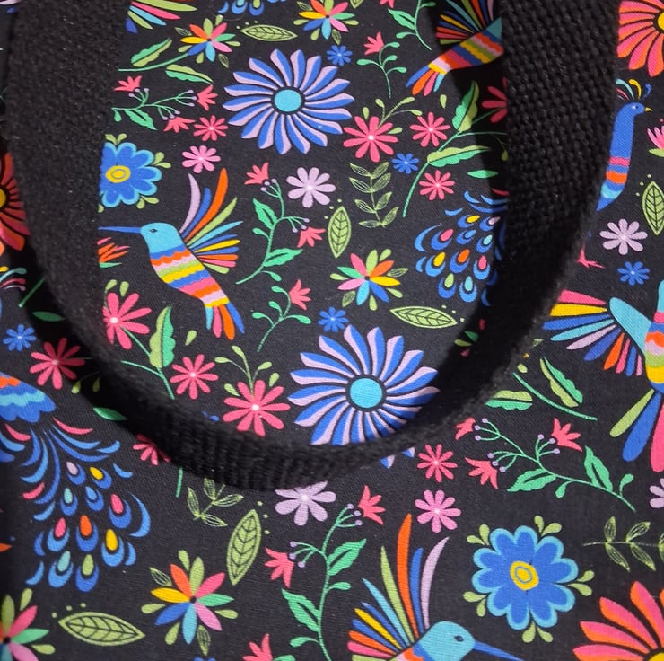 Want to stand out? This 100% cotton tote does just that, it's so colourful. The outer fabric features colourful birds and flowers on a black background. The lining inside is a deep purple colour and inside also has a handy pocket for holding keys, phone, purse or whatever you need to find quickly.